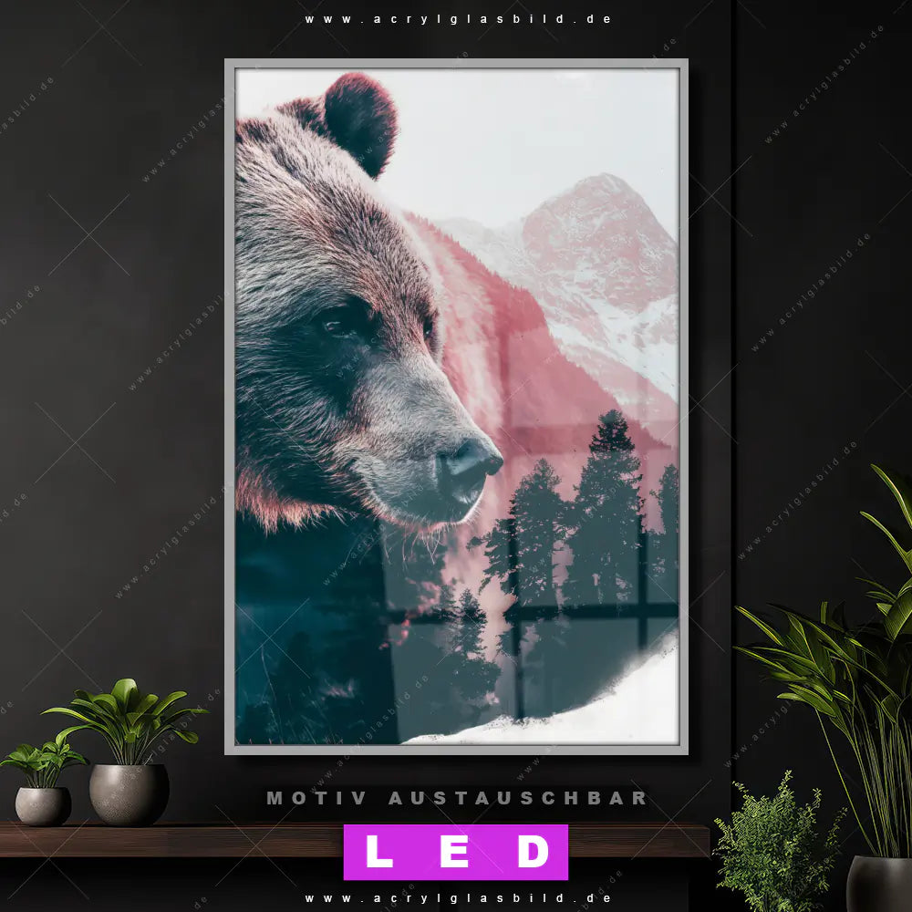 Wer braucht schon langweilige Wände, wenn man sie mit unserem LED Acrylglasbild Canvalight® DIA Bär im Gebirge aufpeppen kann? Dank der genialen LED-Ausleuchtung wirst du in Arzt - Praxis, Bar - Gastronomie, Büro - Kanzlei, Wohnzimmer - Schlafzimmer nie wieder über deine eigenen Füße stolpern. Wenn du nach einem beleuchteten Wandbild aus Acrylglas mit Bär, Wald, Doppelbelichtung, Natur, skandinavisch, Bäume, Berge, Gebirge, Grizzly, Braunbär suchst, dann ist unser LED Acrylglasbild Bär mit Bergen in den hammermäßigen Motiv-Farben Braun, Weiss, Schwarz, Rosa, Beige genau das richtige LED Bild für dich. Im coolen Modern Art, Mixed Media Stil gestaltet, passt das LED Leuchtbild mit DIA-Klapprahmen und glänzender Front aus Acrylglas perfekt zu jedem Einrichtungsstil – sogar zu deinem chaotischen Kreativlabor!
