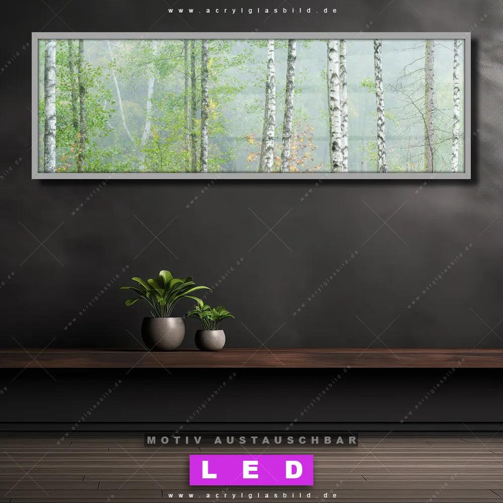 Deine Wände könnten dringend ein dimmbares LED Bild mit Fernbedienung und optionaler Farbtemperatursteuerung gebrauchen? Dann haben wir das perfekte Wandbild mit LED Beleuchtung für dich: unser mega-cooles Wald - Bäume, Landschaften Canvalight® DIA LED Acrylglasbild! Mit unserem angesagten Leuchtbild aus Acrylglas im Panorama-Format und der austauschbaren bedruckten Acrylglas-Scheibe Nebliger Birkenwald bringst du nicht nur Licht, sondern auch jede Menge Flair in deine Räume.