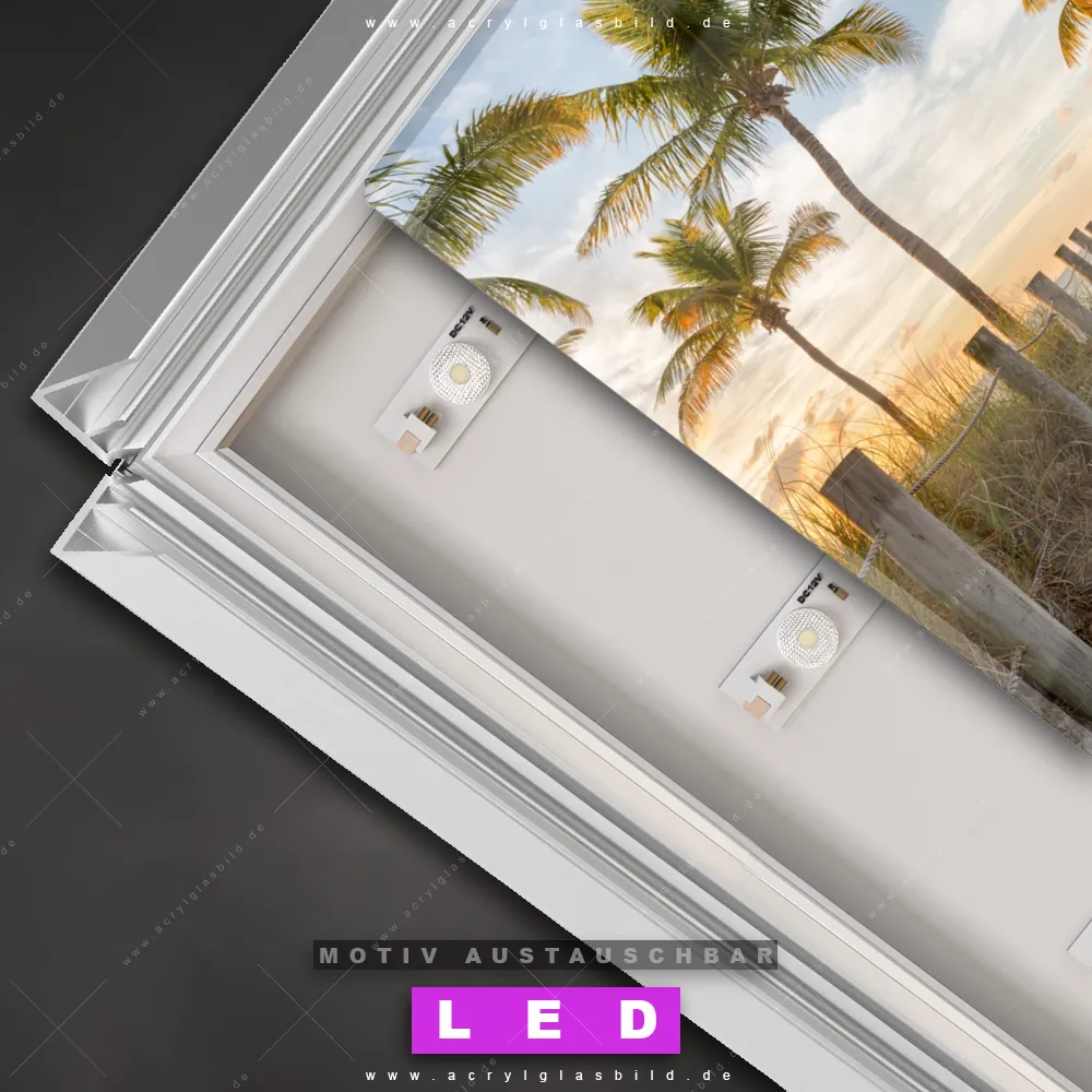Also, worauf wartest du noch? Gib mit einem beleuchteten Wandbild mit wechselbarer Acrylglas-Scheibe deinen Wänden das gewisse Etwas und bestelle jetzt das LED Acrylglasbild Canvalight® DIA Strand mit Palmen – dein Zuhause wird es dir danken und deine Freunde werden dank der wechselbaren Motive erblassen!