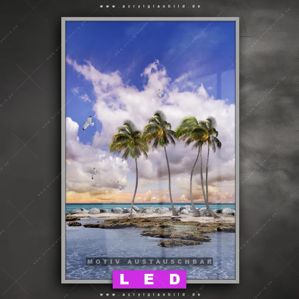 Du suchst nach einem Wandbild mit LED Beleuchtung als ultimativen Hingucker für deine Wände? Dann haben wir das perfekte dimmbare LED Bild mit Fernbedienung und optionaler Farbtemperatursteuerung für dich: unser abgefahrenes Landschaften, Strand - Meer Canvalight® DIA LED Acrylglasbild! Mit dem LED Leuchtbild aus Acrylglas Palmen auf Insel im Hochformat mit austauschbarer bedruckter Acrylglas-Scheibe bringst du nicht nur Licht, sondern auch ordentlich Stil in deine Bude.