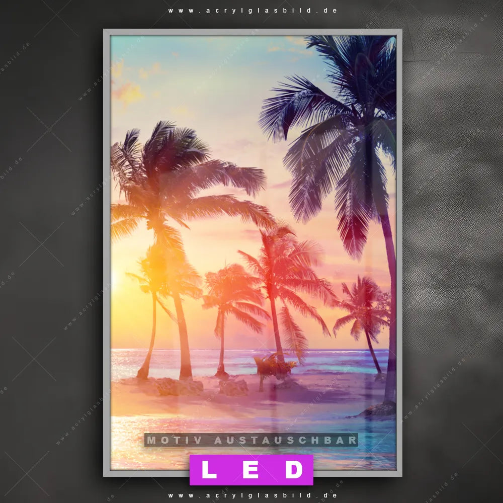 Du suchst nach einem Wandbild mit LED Beleuchtung als ultimativen Hingucker für deine Wände? Dann haben wir das perfekte dimmbare LED Bild mit Fernbedienung und optionaler Farbtemperatursteuerung für dich: unser abgefahrenes Landschaften, Strand - Meer Canvalight® DIA LED Acrylglasbild! Mit dem LED Leuchtbild aus Acrylglas Palmen bei Sonnenuntergang im Hochformat mit austauschbarer bedruckter Acrylglas-Scheibe bringst du nicht nur Licht, sondern auch ordentlich Stil in deine Bude.