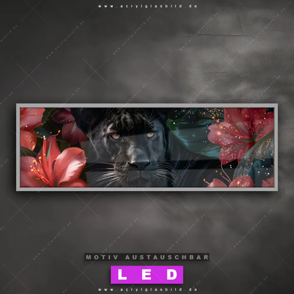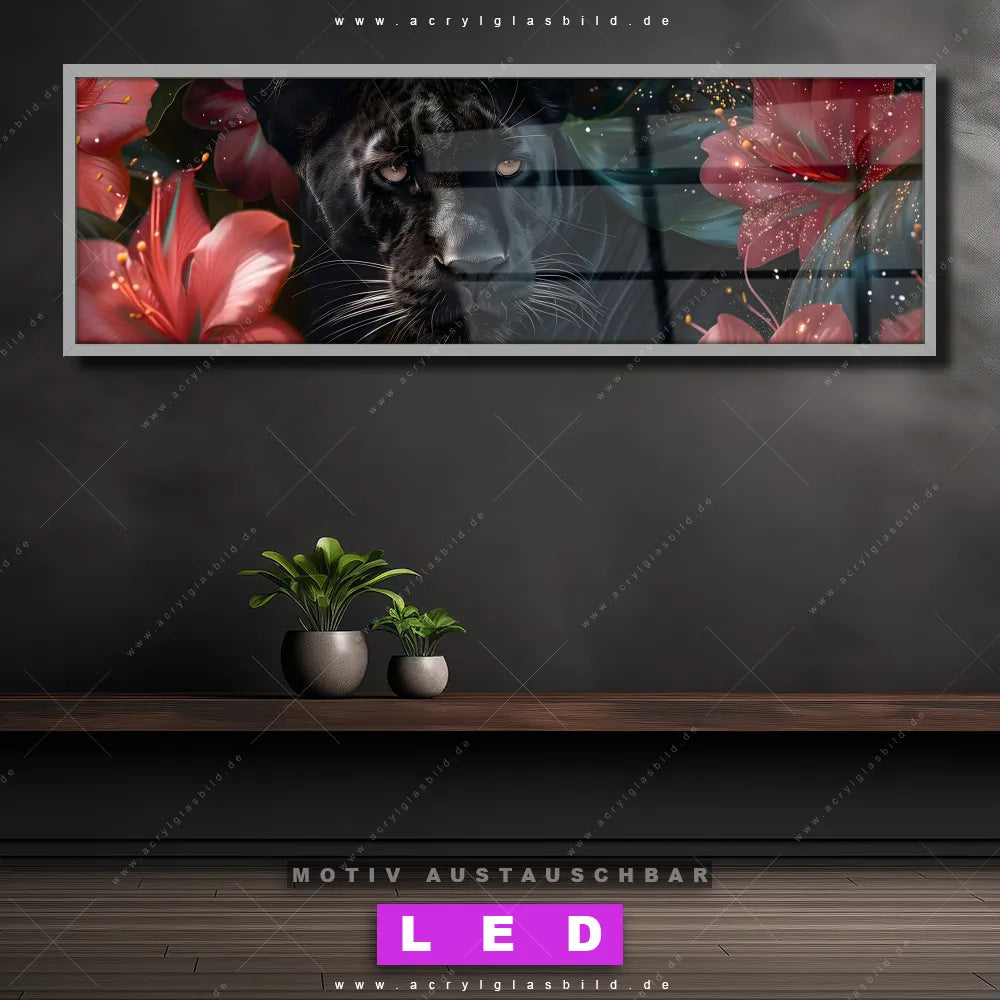 LED Acrylglasbild Canvalight® DIA | Panther und rote Blüten | Panorama