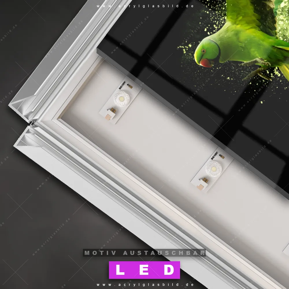 Du bist auf der Suche nach einem dimmbaren Tierwelt LED Bild mit Fernbedienung und optionaler Farbtemperatursteuerung? Dann haben wir hier genau das richtige Wandbild mit LED Beleuchtung für dich: Unser Canvalight® DIA LED Acrylglasbild Papagei - grüne Farbexplosion im Querformat mit austauschbarer bedruckter Acrylglas-Scheibe. Dieses Leuchtbild bringt sofort Partybeleuchtung in deine Räume!