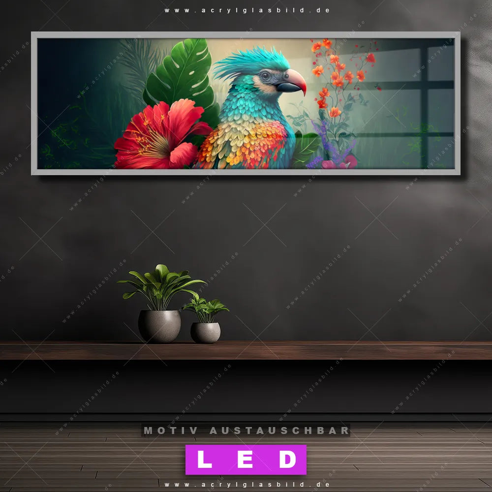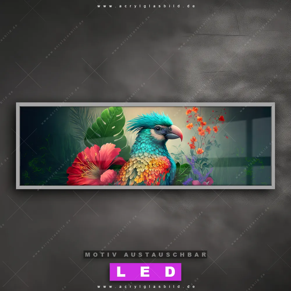 LED Acrylglasbild Canvalight® DIA | Papagei und tropischer Hibiskus | Panorama