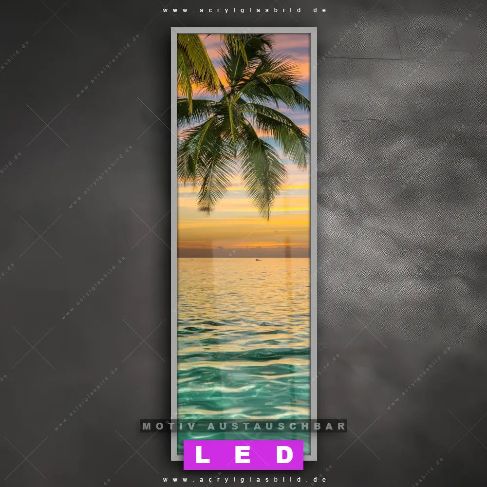Bist du bereit, deine Wände mit einem dimmbaren LED Bild mit Fernbedienung und optionaler Farbtemperatursteuerung auf das nächste Level zu bringen? Unser Landschaften, Strand - Meer Canvalight® DIA LED Acrylglasbild ist genau das, was du brauchst! Das Wandbild mit LED Beleuchtung im Schmalen Format mit austauschbarer bedruckter Acrylglas-Scheibe Paradiesische Insel bringt Licht und Stil in dein Zuhause – und das in null Komma nichts!