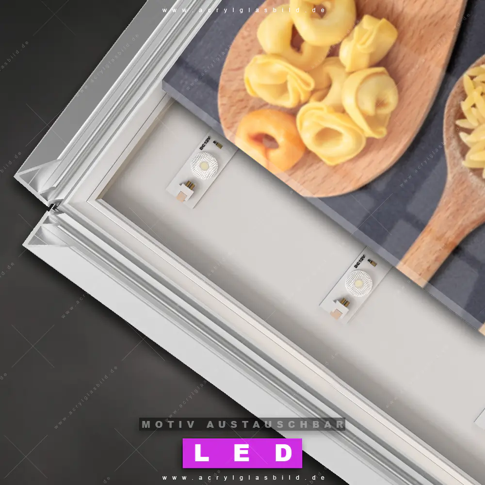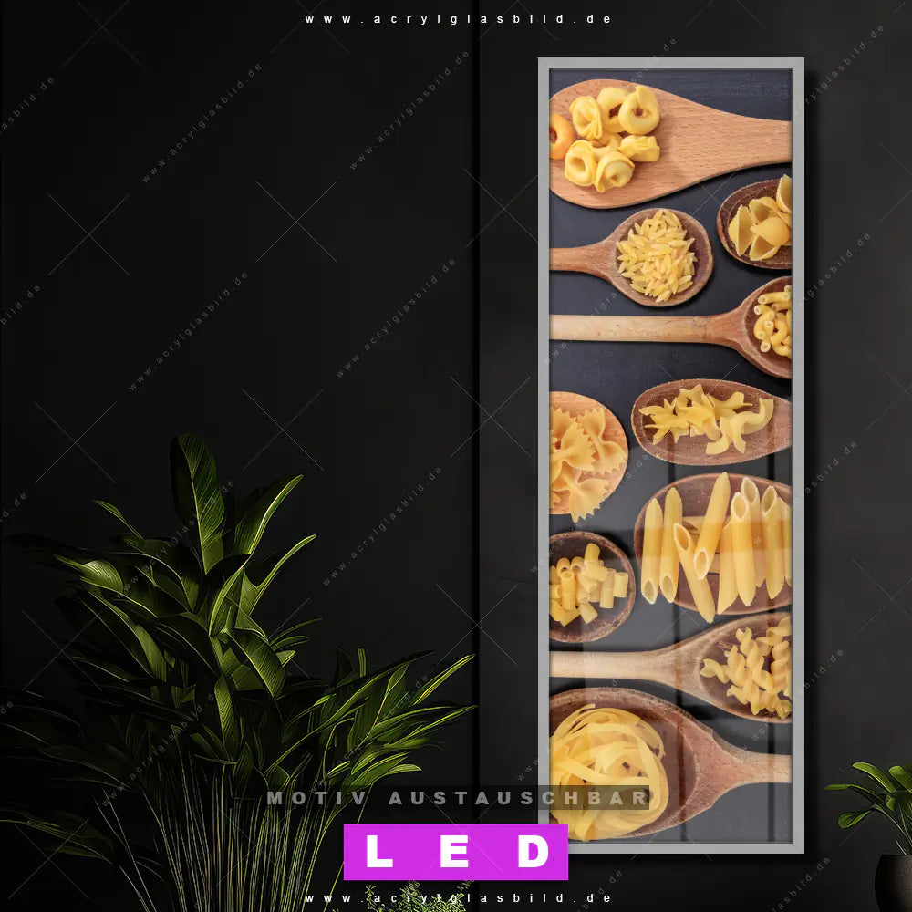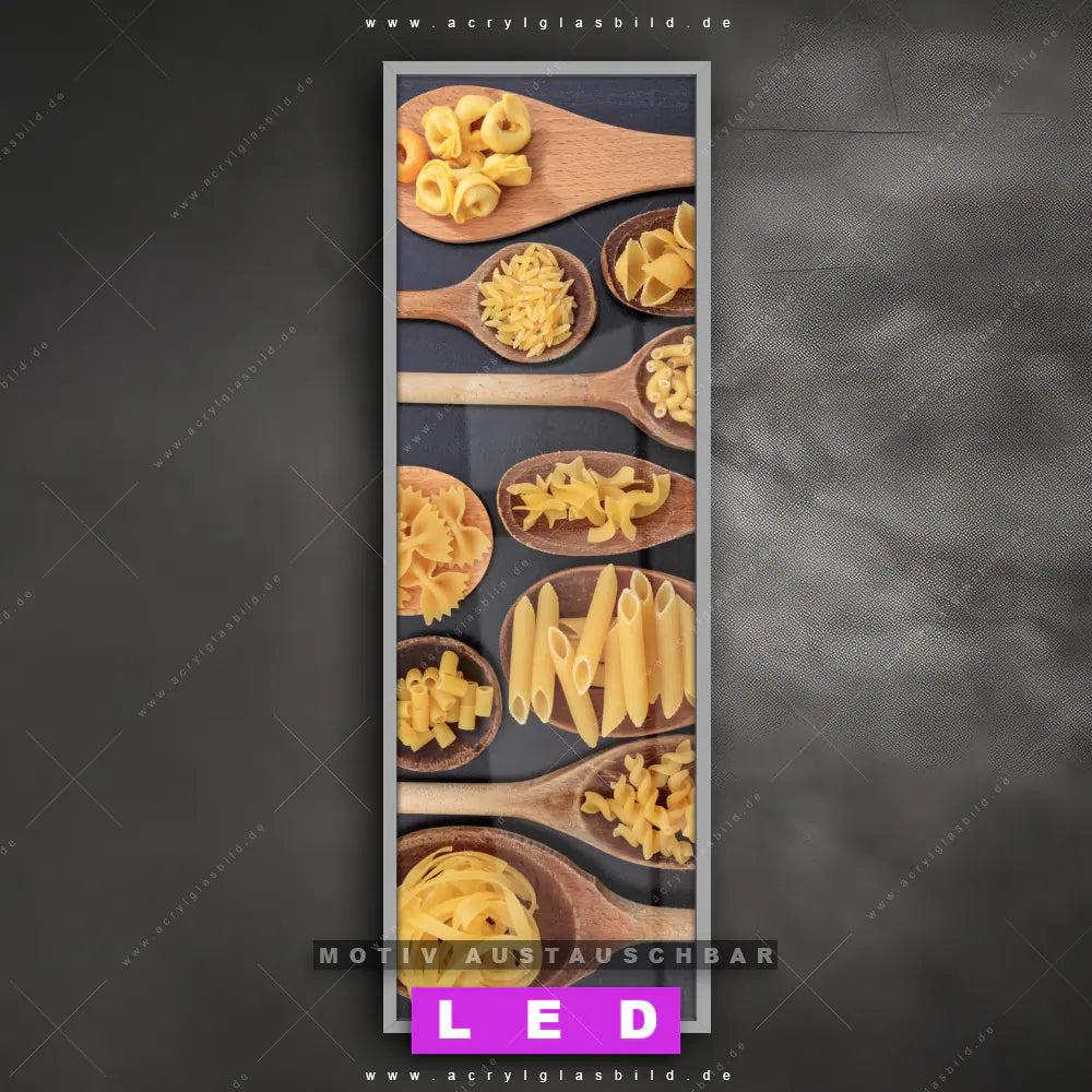 Bist du bereit, deine Wände mit einem dimmbaren LED Bild mit Fernbedienung und optionaler Farbtemperatursteuerung auf das nächste Level zu bringen? Unser Essen - Trinken Canvalight® DIA LED Acrylglasbild ist genau das, was du brauchst! Das Wandbild mit LED Beleuchtung im Schmalen Format mit austauschbarer bedruckter Acrylglas-Scheibe Pasta auf Löffeln bringt Licht und Stil in dein Zuhause – und das in null Komma nichts!