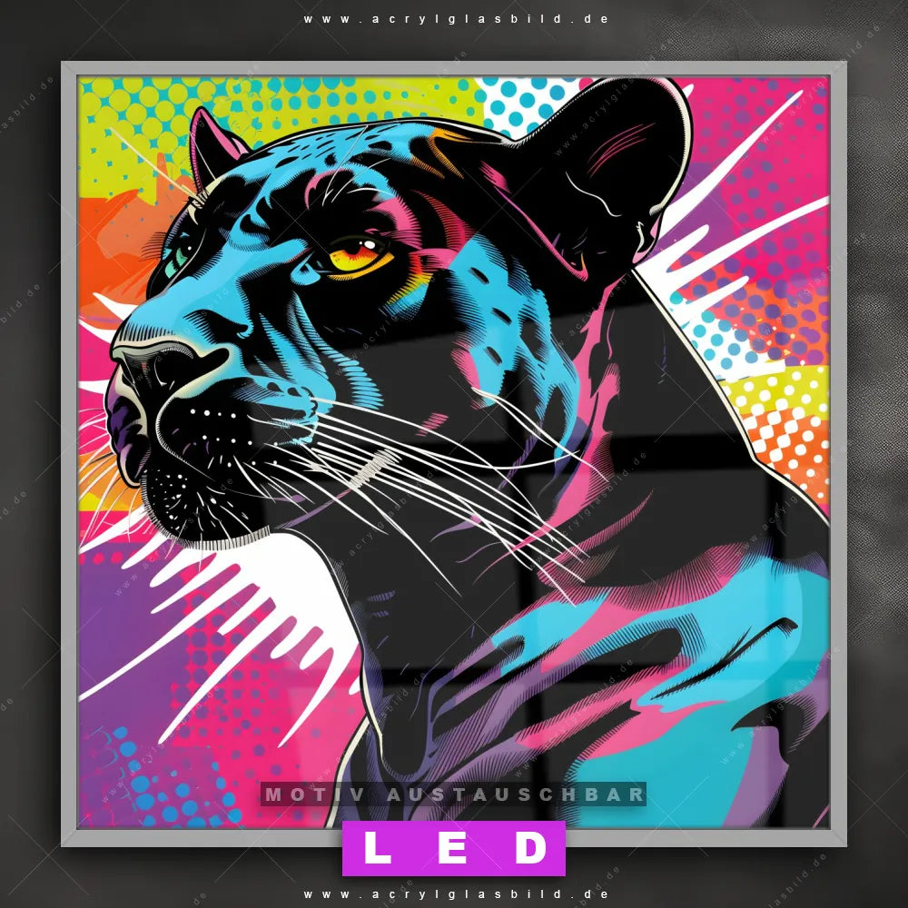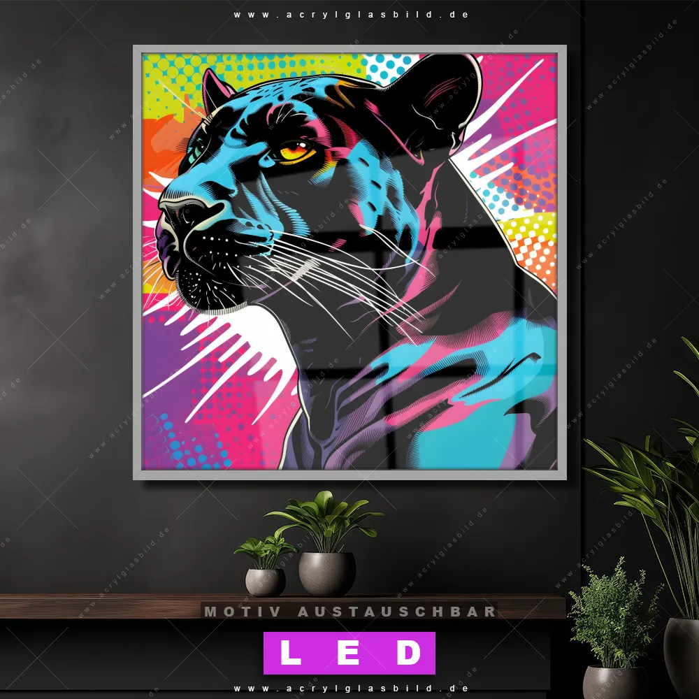 Bist du bereit, deine Wände mit einem dimmbaren LED Bild mit Fernbedienung und optionaler Farbtemperatursteuerung zum Leuchten zu bringen? Wir haben das ultimative Tierwelt LED Acrylglasbild Canvalight® DIA für dich! Unser LED Wandbild aus Acrylglas Pop Art Panther im Quadratischen Format mit austauschbarer bedruckter Acrylglas-Scheibe im DIA-Klapprahmen bringt sofort jede Menge Glanz in deine vier Wände.