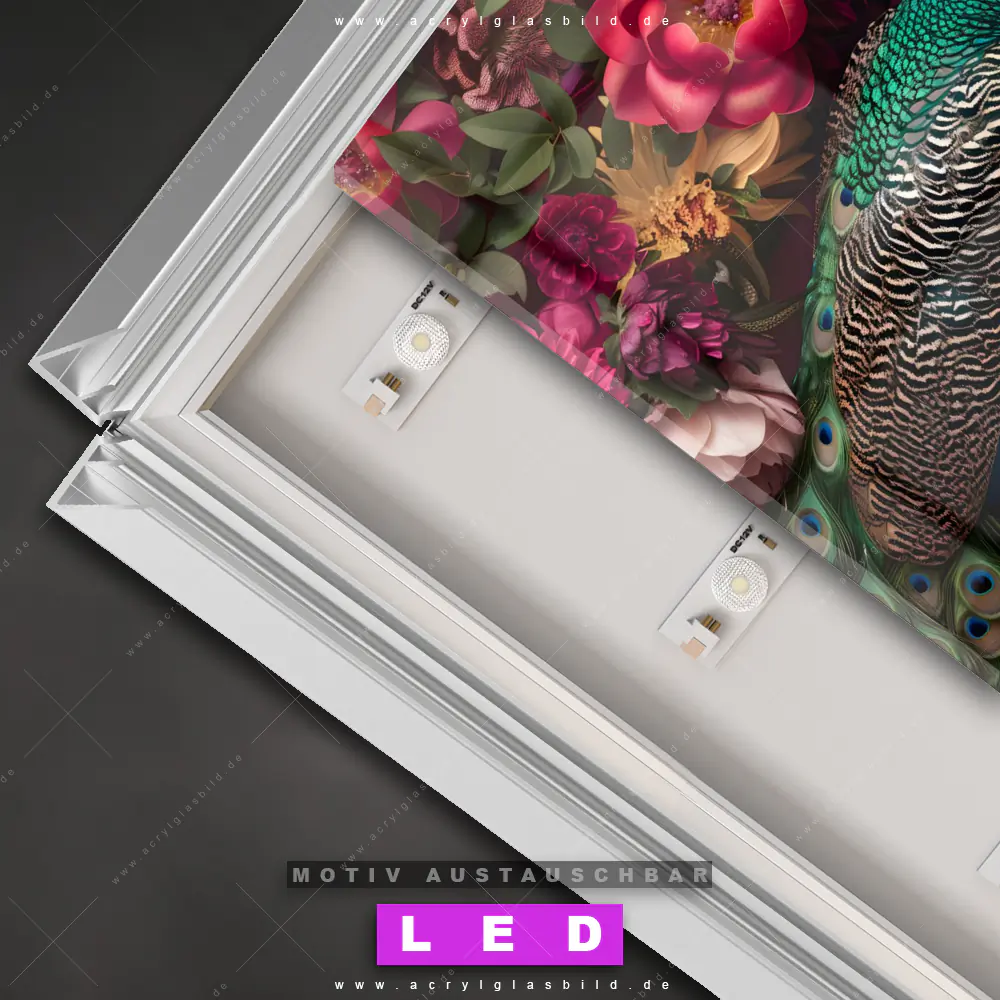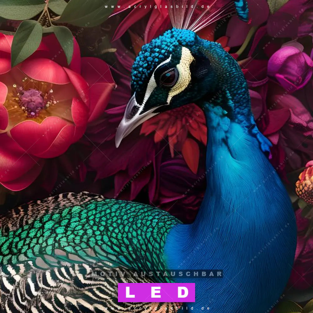 Bist du bereit, deine Wände mit einem dimmbaren LED Bild mit Fernbedienung und optionaler Farbtemperatursteuerung zum Leuchten zu bringen? Wir haben das ultimative Tierwelt, Blumen - Botanik LED Acrylglasbild Canvalight® DIA für dich! Unser LED Wandbild aus Acrylglas Prachtvoller Pfau und Blüten im Quadratischen Format mit austauschbarer bedruckter Acrylglas-Scheibe im DIA-Klapprahmen bringt sofort jede Menge Glanz in deine vier Wände.