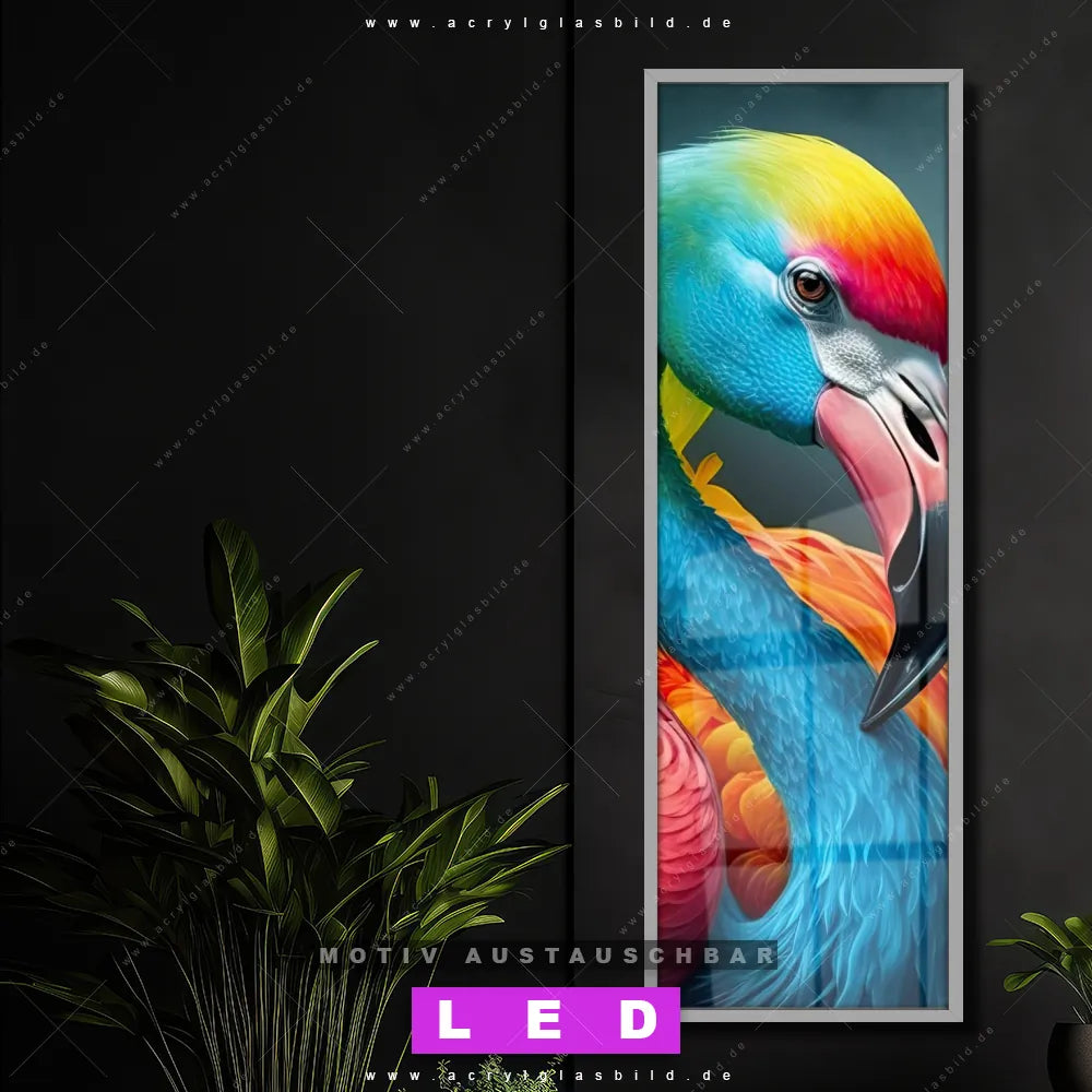 Vergiss dunkle Ecken und langweilige Wände in Flur - Eingangsbereich, Wohnzimmer - Schlafzimmer! Mit unserem LED Acrylglasbild Canvalight® DIA Tanz der Flamingos wirst du nie wieder im Dunkeln tappen. Suchst du nach einem beleuchteten Wandbild mit Vogel, Flamingo, Dschungel, Wasser, Farbe, Regenbogen? Dann ist unser Leuchtbild Zwei bunte Vögel in Harmonie mit den strahlenden Motiv-Farben Pink, Blau, Orange genau das richtige LED Bild für dich. Egal, ob dein Stil minimalistisch oder exotisch ist, dieses LED Leuchtbild im Pop Art Stil mit DIA-Klapprahmen und glänzender Front aus Acrylglas passt perfekt zu jeder Einrichtung.