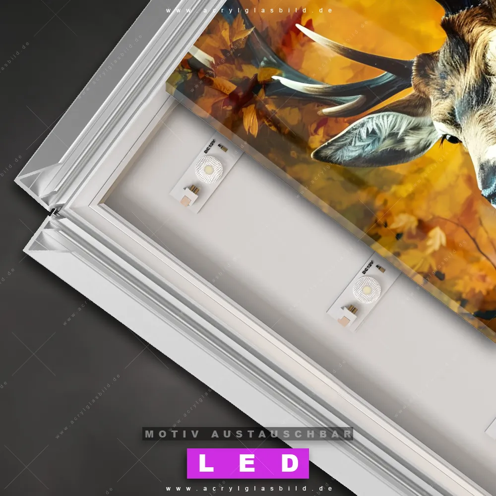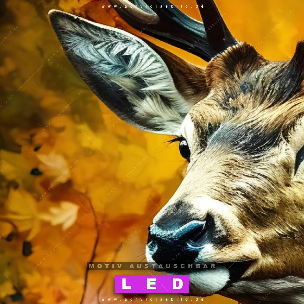 Bist du bereit, deine Wände mit einem dimmbaren LED Bild mit Fernbedienung und optionaler Farbtemperatursteuerung zum Leuchten zu bringen? Wir haben das ultimative Tierwelt LED Acrylglasbild Canvalight® DIA für dich! Unser LED Wandbild aus Acrylglas Rothirsch im Herbstwald im Quadratischen Format mit austauschbarer bedruckter Acrylglas-Scheibe im DIA-Klapprahmen bringt sofort jede Menge Glanz in deine vier Wände.