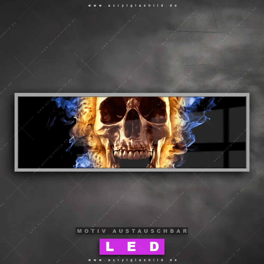 Deine Wände könnten dringend ein dimmbares LED Bild mit Fernbedienung und optionaler Farbtemperatursteuerung gebrauchen? Dann haben wir das perfekte Wandbild mit LED Beleuchtung für dich: unser mega-cooles Porträts - Menschen Canvalight® DIA LED Acrylglasbild! Mit unserem angesagten Leuchtbild aus Acrylglas im Panorama-Format und der austauschbaren bedruckten Acrylglas-Scheibe Schädel in Flammen bringst du nicht nur Licht, sondern auch jede Menge Flair in deine Räume.