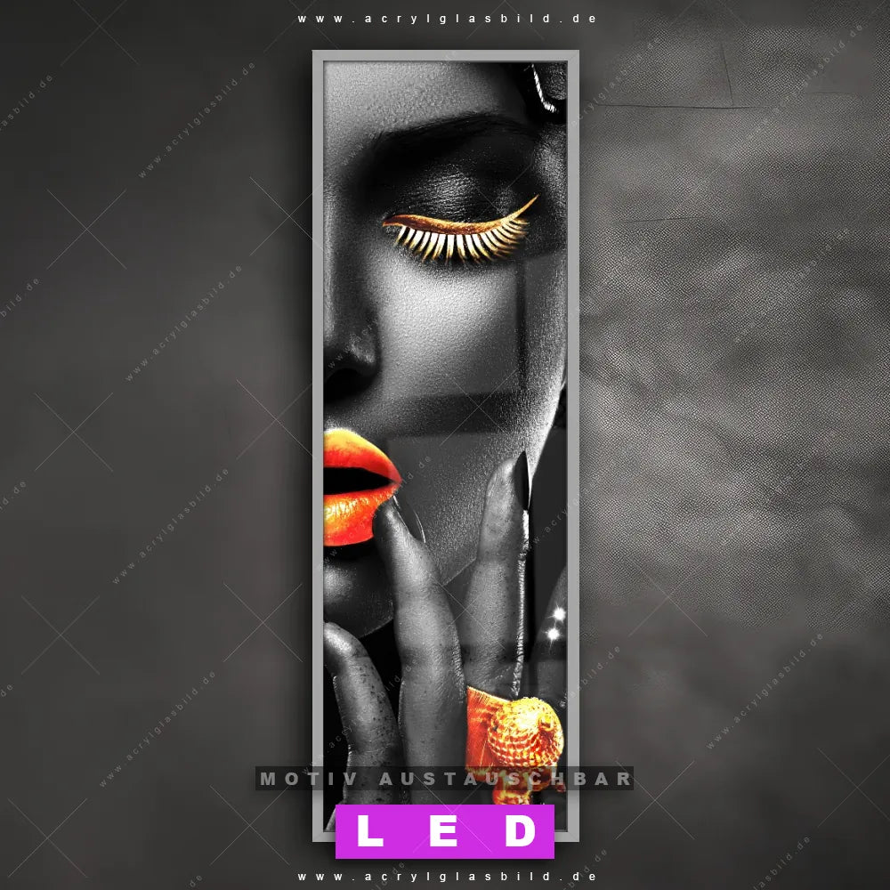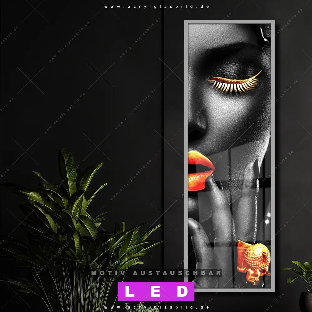 Vergiss dunkle Ecken und langweilige Wände in Bar | Gastronomie, Eingangsbereich, Schlafzimmer, Wohnzimmer! Mit unserem LED Acrylglasbild Canvalight® DIA schwarz-weiß Porträt mit Farbakzenten wirst du nie wieder im Dunkeln tappen. Suchst du nach einem beleuchteten Wandbild mit Frau, Lippen, Mund, Porträt, Erotik, modern, Gold, Silber, Farbe, Beauty? Dann ist unser Leuchtbild schöne Frau mit vollmundigen Lippen mit den strahlenden Motiv-Farben Gold, Silber, Schwarz genau das richtige LED Bild für dich. Egal, ob dein Stil minimalistisch oder exotisch ist, dieses LED Leuchtbild im Modern Art, Schwarz - Weiss Stil mit DIA-Klapprahmen und glänzender Front aus Acrylglas passt perfekt zu jeder Einrichtung.
