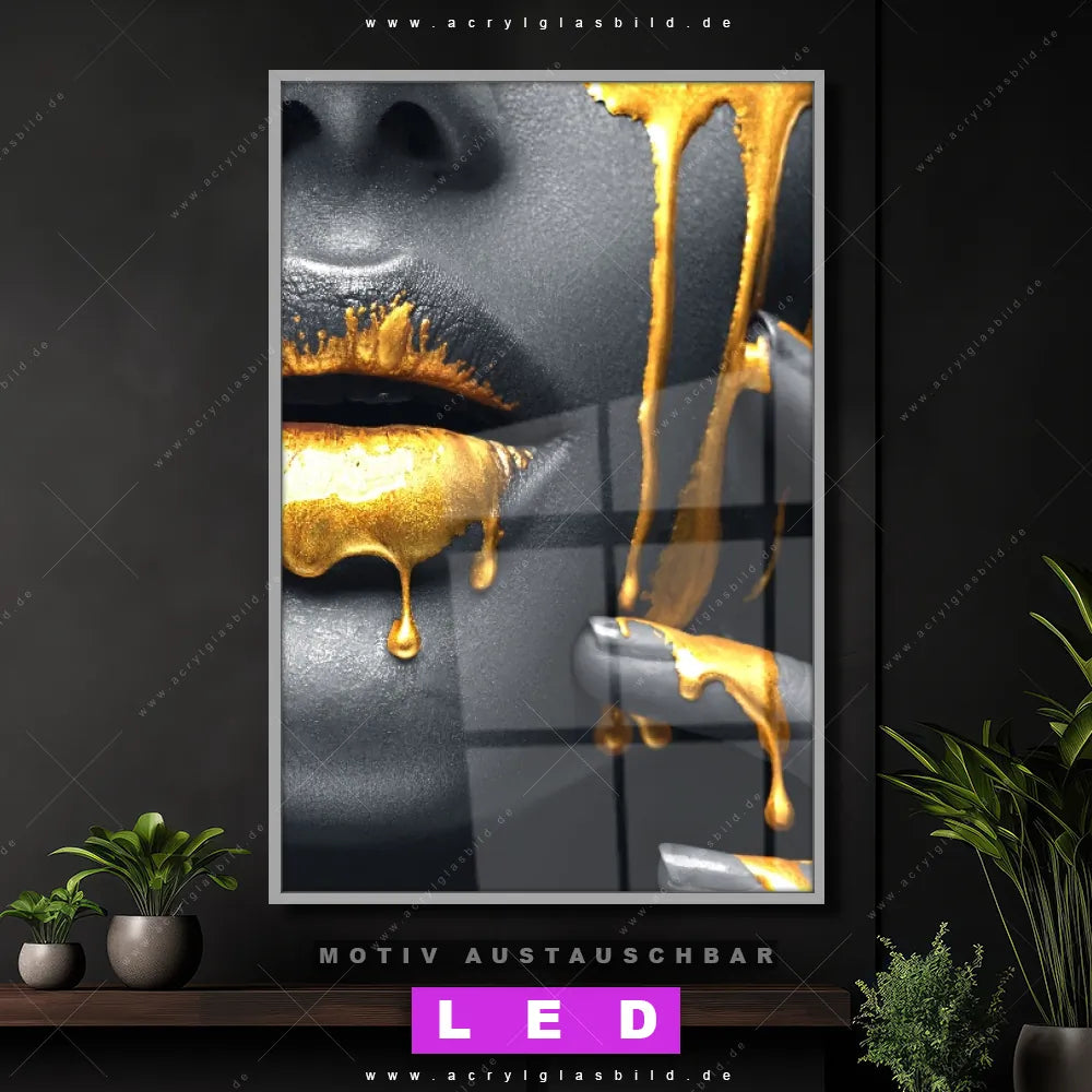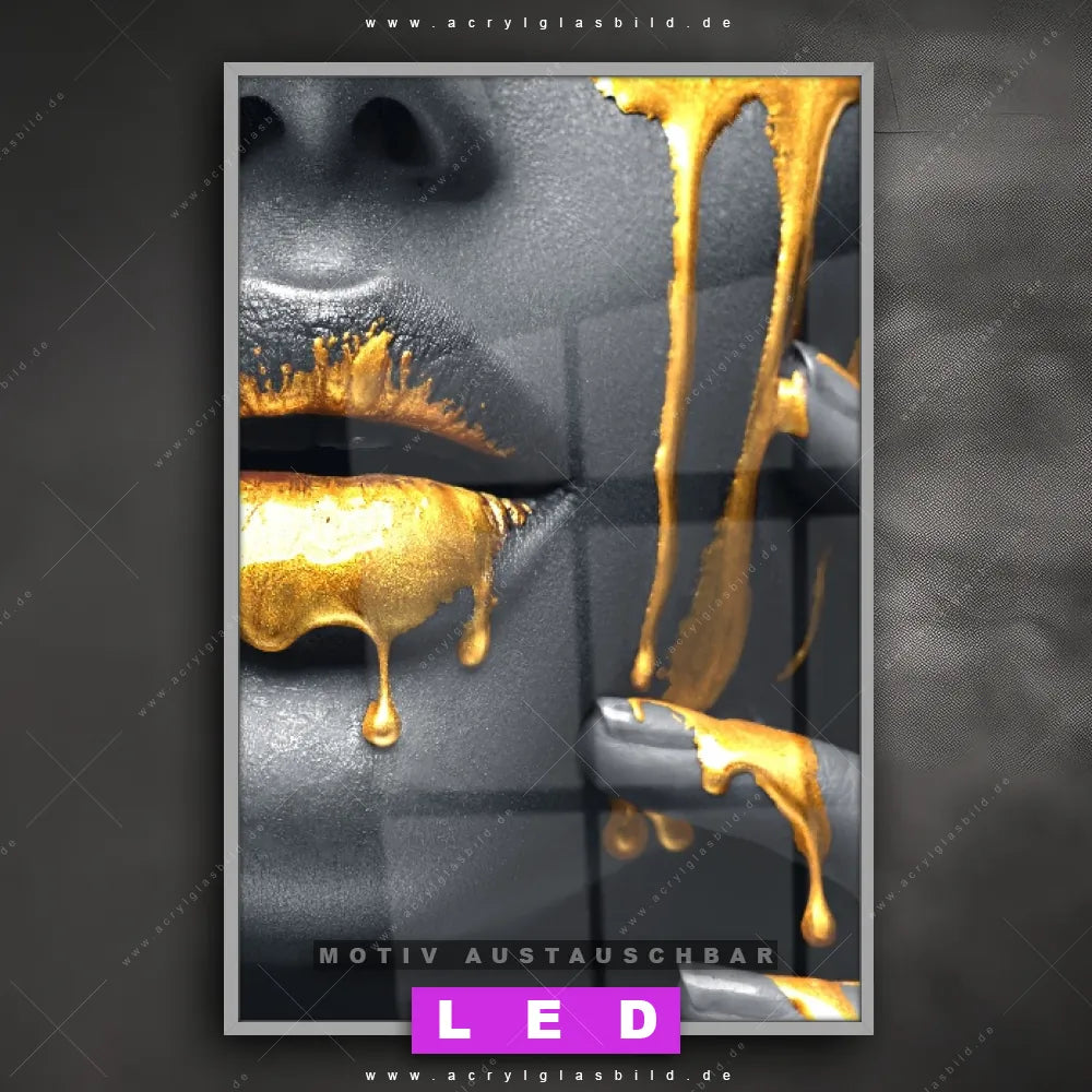 Wer braucht schon langweilige Wände, wenn man sie mit unserem LED Acrylglasbild Canvalight® DIA Gesicht einer Frau in Silber & Gold aufpeppen kann? Dank der genialen LED-Ausleuchtung wirst du in Friseur - Beauty, Wohnzimmer - Schlafzimmer, Flur - Eingangsbereich, Büro - Kanzlei, Bar - Gastronomie nie wieder über deine eigenen Füße stolpern. Wenn du nach einem beleuchteten Wandbild aus Acrylglas mit Frau, Lippen, Mund, Porträt, Erotik, modern, Gold, Silber, Farbe, Beauty suchst, dann ist unser LED Acrylglasbild Goldener Farbfluss über silbernes Gesicht in den hammermäßigen Motiv-Farben Gold, Silber, Schwarz genau das richtige LED Bild für dich. Im coolen Modern Art Stil gestaltet, passt das LED Leuchtbild mit DIA-Klapprahmen und glänzender Front aus Acrylglas perfekt zu jedem Einrichtungsstil – sogar zu deinem chaotischen Kreativlabor!