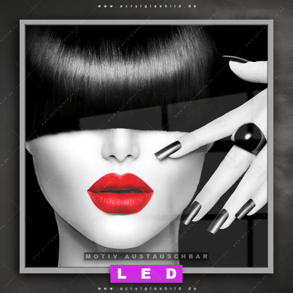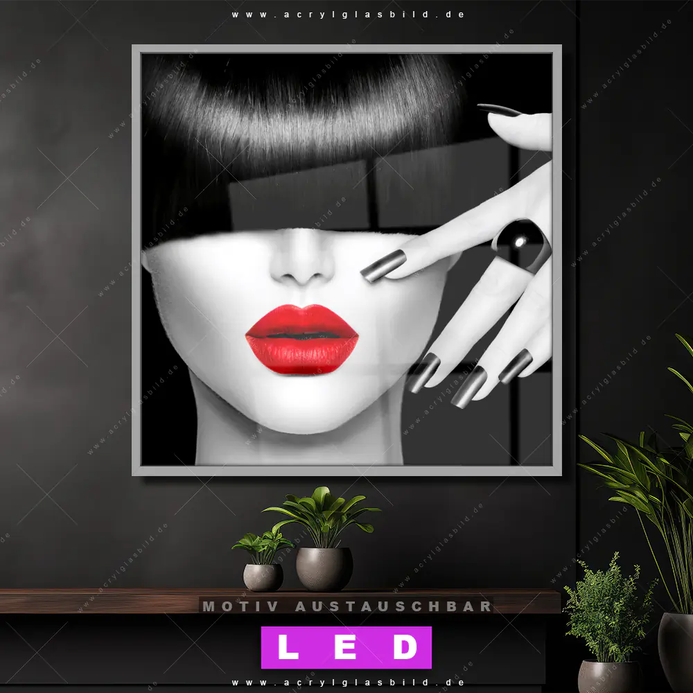 Bist du bereit, deine Wände mit einem dimmbaren LED Bild mit Fernbedienung und optionaler Farbtemperatursteuerung zum Leuchten zu bringen? Wir haben das ultimative Porträts - Menschen LED Acrylglasbild Canvalight® DIA für dich! Unser LED Wandbild aus Acrylglas Schwarze Eleganz & rote Lippen im Quadratischen Format mit austauschbarer bedruckter Acrylglas-Scheibe im DIA-Klapprahmen bringt sofort jede Menge Glanz in deine vier Wände.