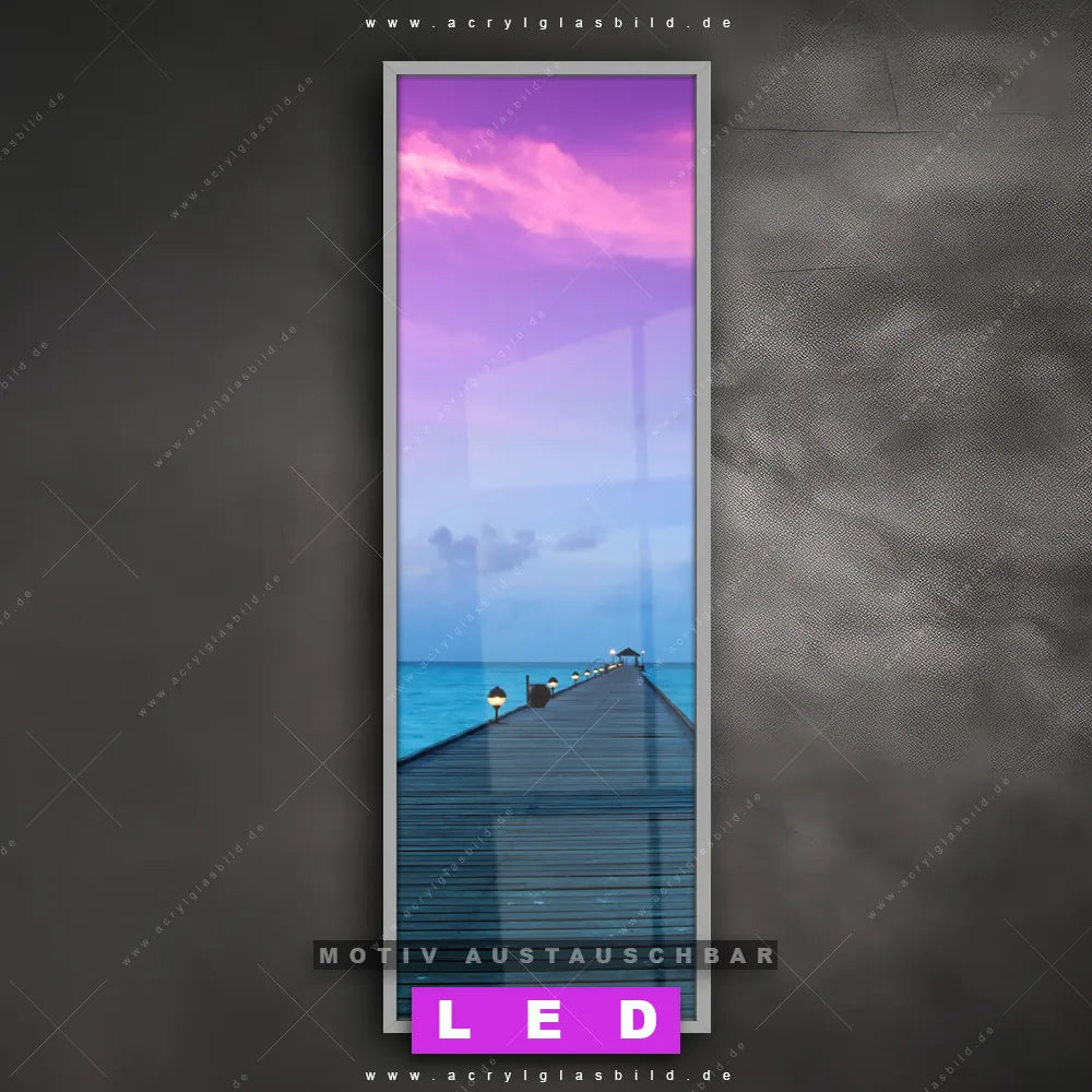 Bist du bereit, deine Wände mit einem dimmbaren LED Bild mit Fernbedienung und optionaler Farbtemperatursteuerung auf das nächste Level zu bringen? Unser Strand - Meer Canvalight® DIA LED Acrylglasbild ist genau das, was du brauchst! Das Wandbild mit LED Beleuchtung im Schmalen Format mit austauschbarer bedruckter Acrylglas-Scheibe Sonnenuntergang auf den Malediven bringt Licht und Stil in dein Zuhause – und das in null Komma nichts!