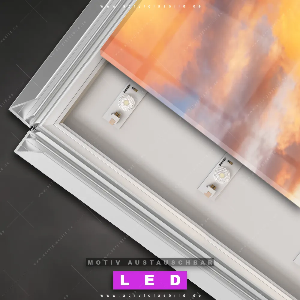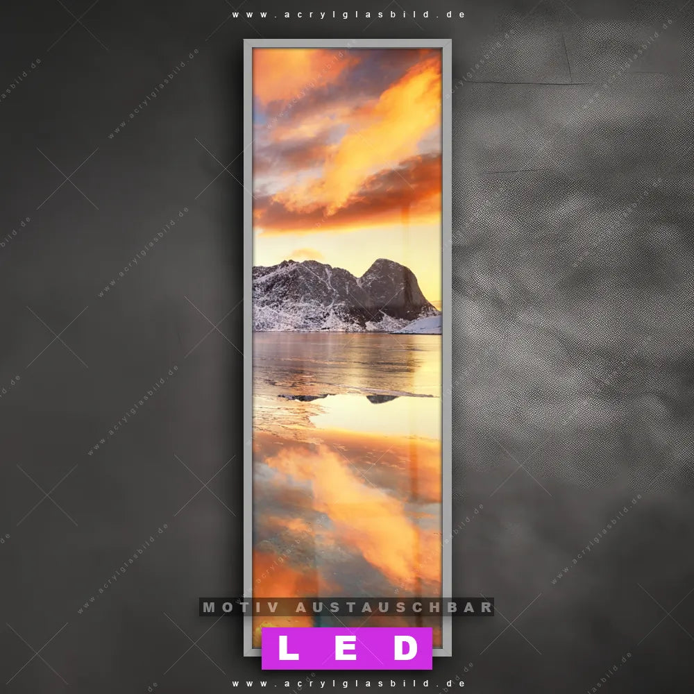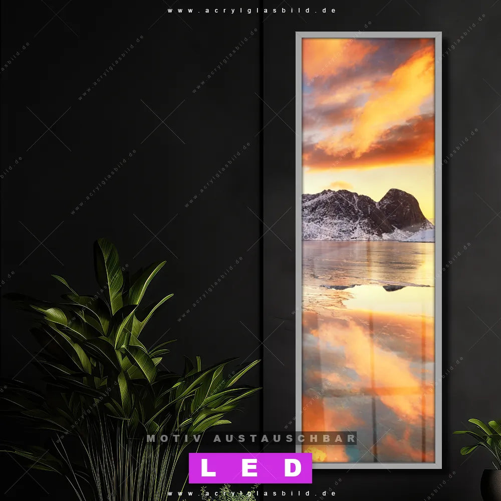Bist du bereit, deine Wände mit einem dimmbaren LED Bild mit Fernbedienung und optionaler Farbtemperatursteuerung auf das nächste Level zu bringen? Unser Landschaften Canvalight® DIA LED Acrylglasbild ist genau das, was du brauchst! Das Wandbild mit LED Beleuchtung im Schmalen Format mit austauschbarer bedruckter Acrylglas-Scheibe Sonnenuntergang Norwegen bringt Licht und Stil in dein Zuhause – und das in null Komma nichts!