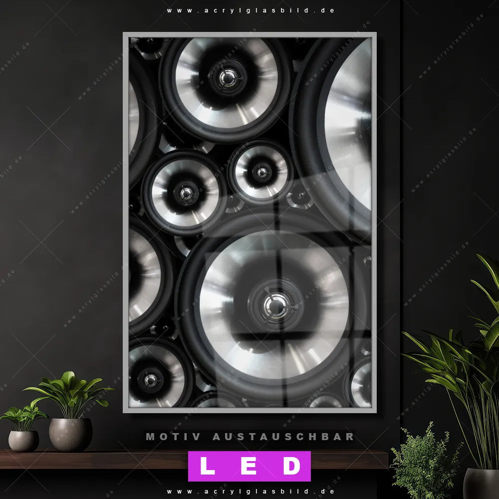 Wer braucht schon langweilige Wände, wenn man sie mit unserem LED Acrylglasbild Canvalight® DIA Bassbox Musikboxen aufpeppen kann? Dank der genialen LED-Ausleuchtung wirst du in Wohnzimmer - Schlafzimmer, Bar - Gastronomie, Flur - Eingangsbereich nie wieder über deine eigenen Füße stolpern. Wenn du nach einem beleuchteten Wandbild aus Acrylglas mit Musik, musikalisch, Lautsprecher, Verstärker suchst, dann ist unser LED Acrylglasbild Musik Soundboxen in den hammermäßigen Motiv-Farben Schwarz, Weiss, Silber genau das richtige LED Bild für dich. Im coolen Modern Art Stil gestaltet, passt das LED Leuchtbild mit DIA-Klapprahmen und glänzender Front aus Acrylglas perfekt zu jedem Einrichtungsstil – sogar zu deinem chaotischen Kreativlabor!