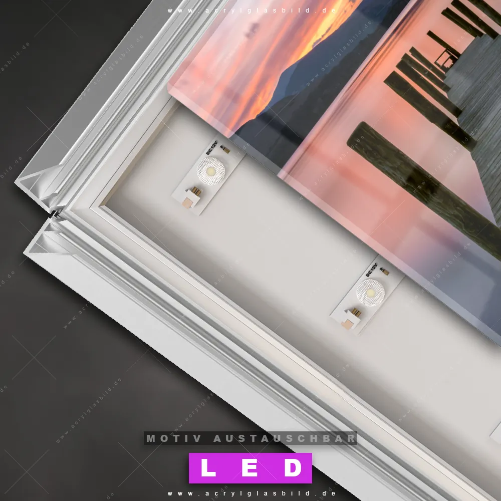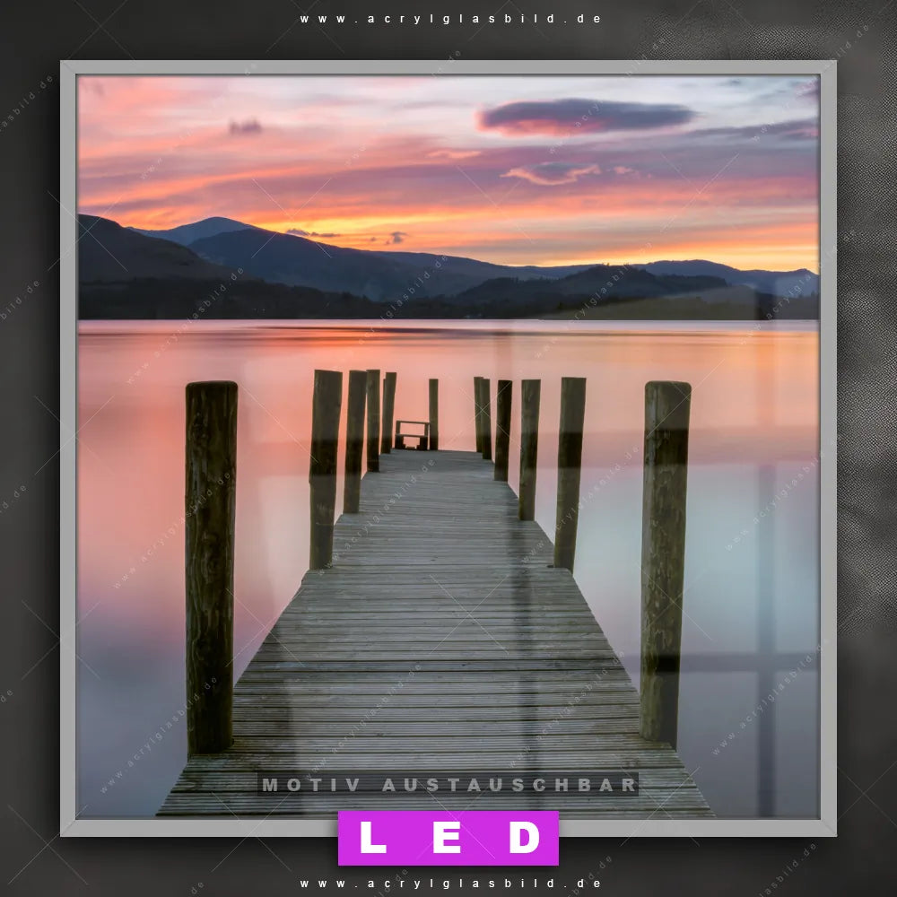 Also, worauf wartest du noch? Gib mit einem beleuchteten Wandbild mit wechselbarer Acrylglas-Scheibe deinen Wänden das gewisse Etwas und bestelle jetzt das LED Acrylglasbild Canvalight® DIA Sonnenuntergang am Holzsteg – dein Zuhause wird es dir danken und deine Freunde werden dank der wechselbaren Motive erblassen!