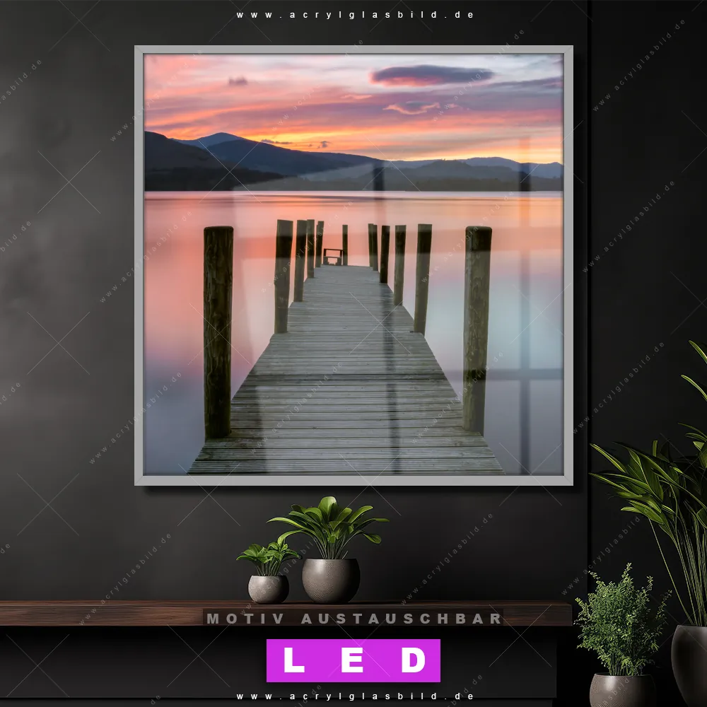 Bist du bereit, deine Wände mit einem dimmbaren LED Bild mit Fernbedienung und optionaler Farbtemperatursteuerung zum Leuchten zu bringen? Wir haben das ultimative Strand - Meer, Landschaften LED Acrylglasbild Canvalight® DIA für dich! Unser LED Wandbild aus Acrylglas Steg in den Sonnenuntergang im Quadratischen Format mit austauschbarer bedruckter Acrylglas-Scheibe im DIA-Klapprahmen bringt sofort jede Menge Glanz in deine vier Wände.