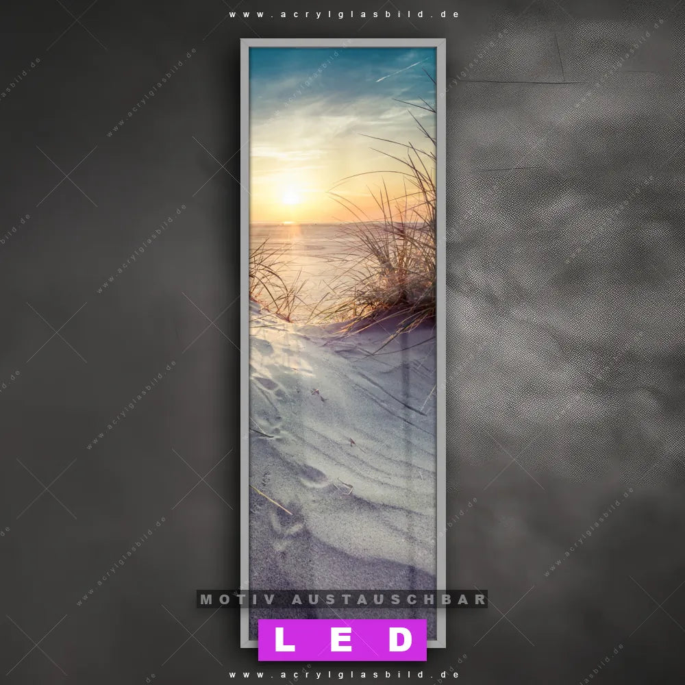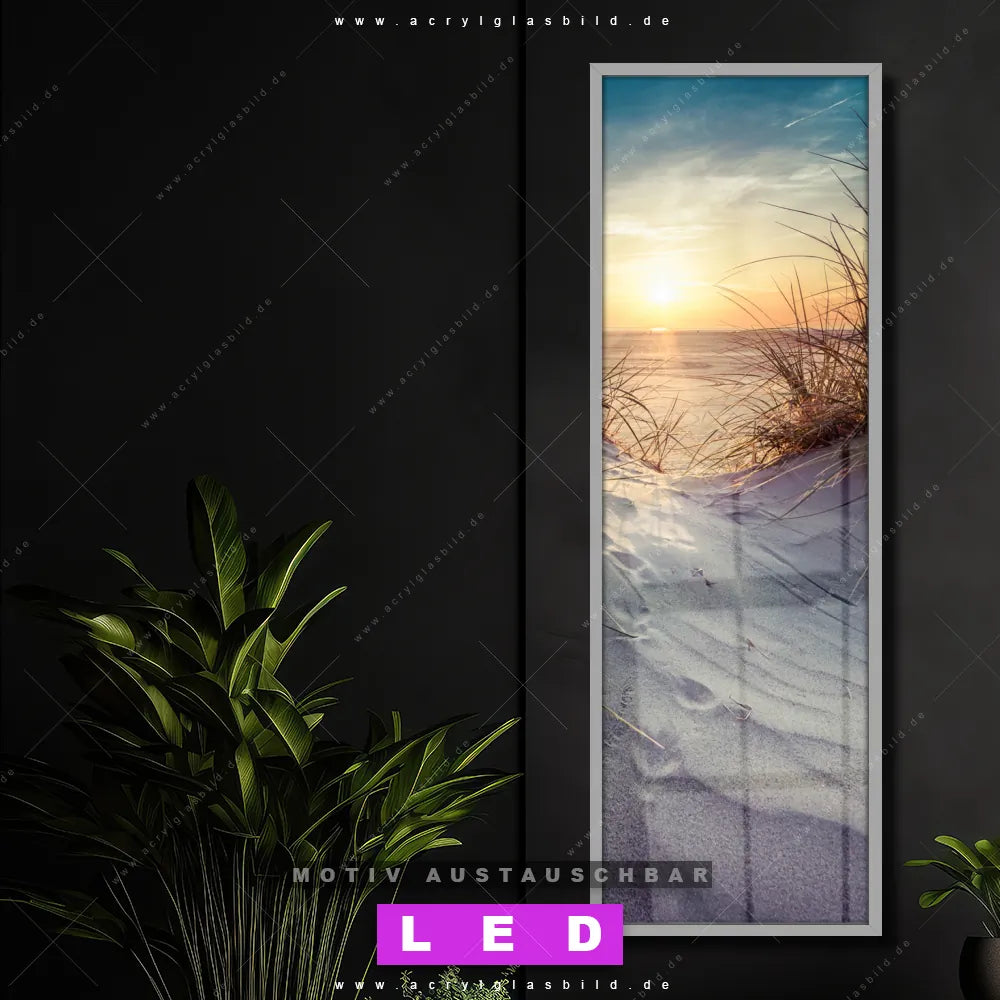 Bist du bereit, deine Wände mit einem dimmbaren LED Bild mit Fernbedienung und optionaler Farbtemperatursteuerung auf das nächste Level zu bringen? Unser Landschaften, Strand - Meer Canvalight® DIA LED Acrylglasbild ist genau das, was du brauchst! Das Wandbild mit LED Beleuchtung im Schmalen Format mit austauschbarer bedruckter Acrylglas-Scheibe Strandlandschaft mit Gras bringt Licht und Stil in dein Zuhause – und das in null Komma nichts!