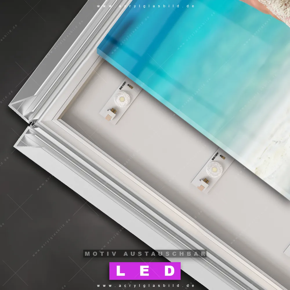 Also, worauf wartest du noch? Gib mit einem beleuchteten Wandbild mit wechselbarer Acrylglas-Scheibe deinen Wänden das gewisse Etwas und bestelle jetzt das LED Acrylglasbild Canvalight® DIA Frau mit nackten Füßen am tropisch weißen Strand – dein Zuhause wird es dir danken und deine Freunde werden dank der wechselbaren Motive erblassen!