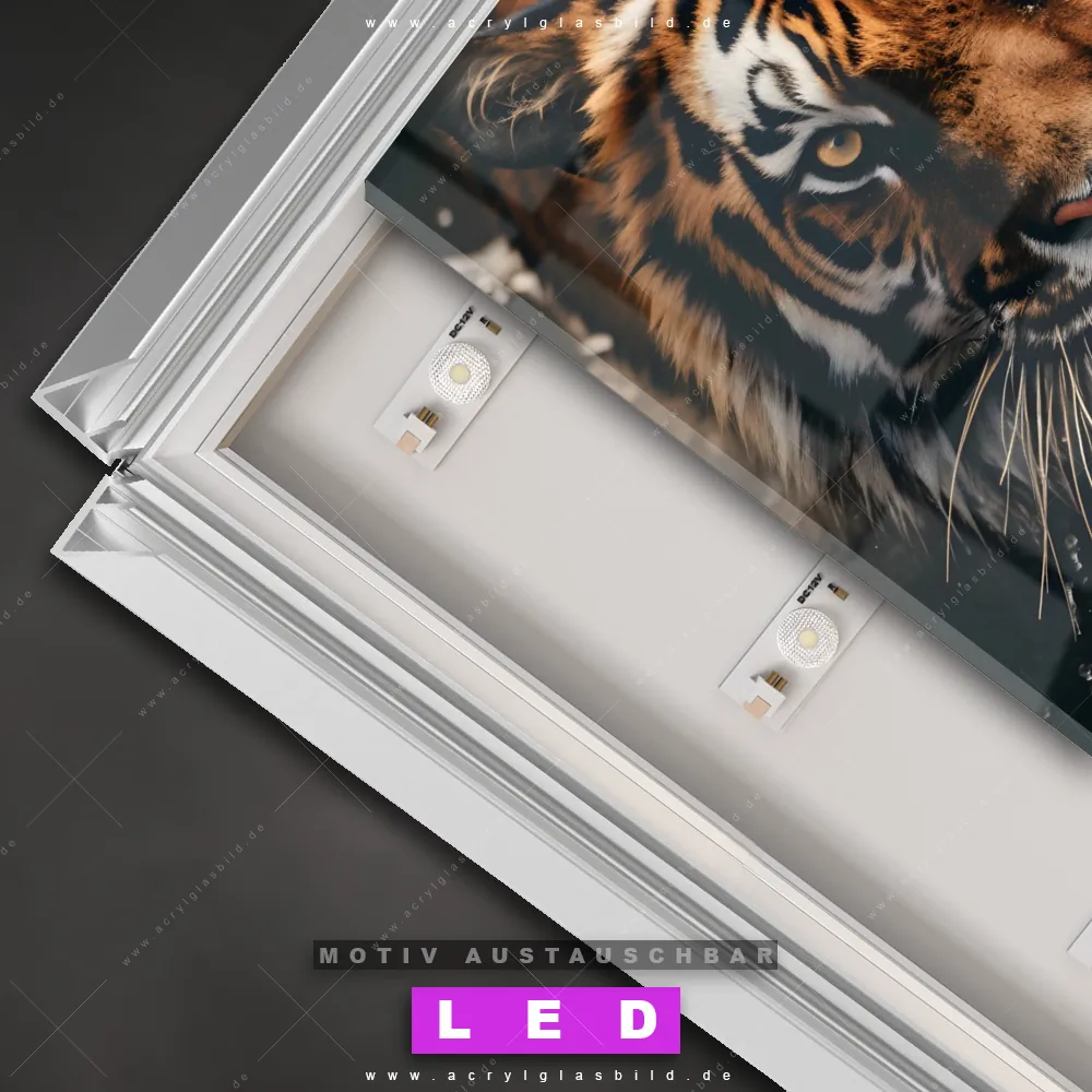 Also, worauf wartest du noch? Gib mit einem beleuchteten Wandbild mit wechselbarer Acrylglas-Scheibe deinen Wänden das gewisse Etwas und bestelle jetzt das LED Acrylglasbild Canvalight® DIA Amur-Tiger – dein Zuhause wird es dir danken und deine Freunde werden dank der wechselbaren Motive erblassen!