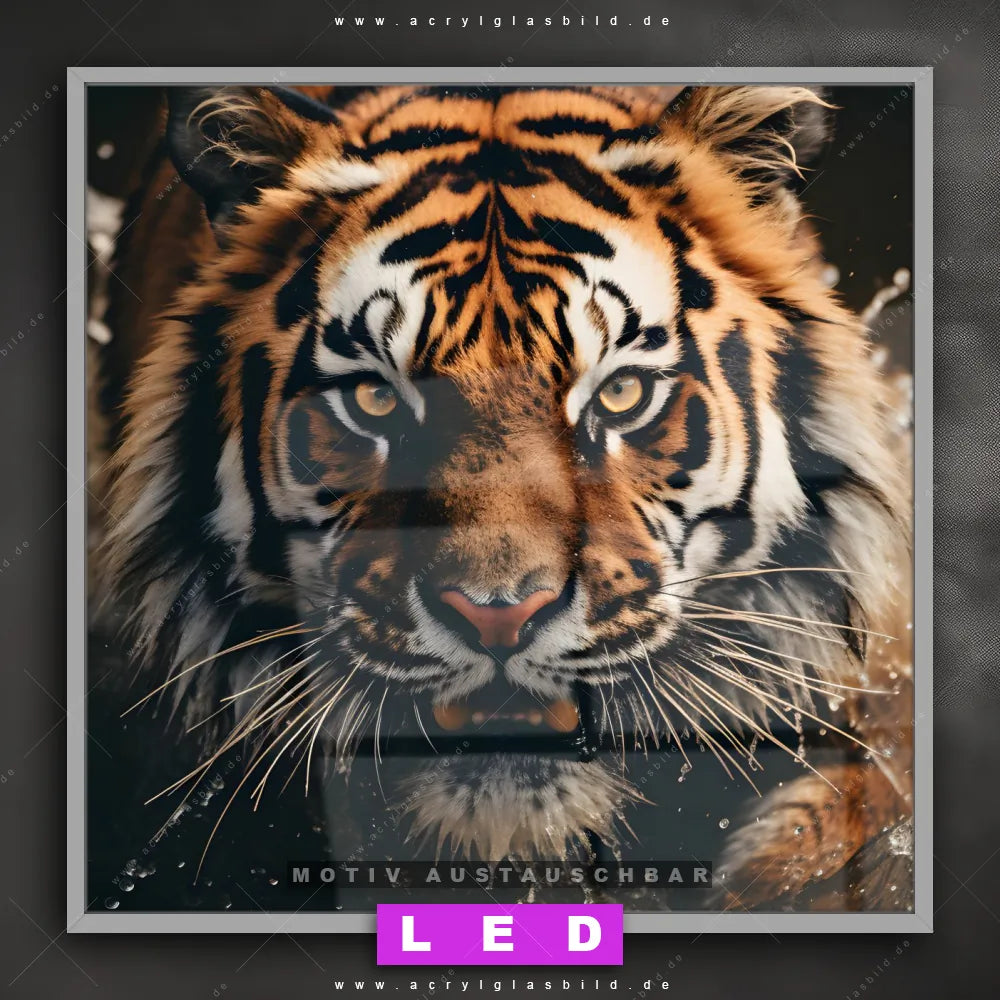 Bist du bereit, deine Wände mit einem dimmbaren LED Bild mit Fernbedienung und optionaler Farbtemperatursteuerung zum Leuchten zu bringen? Wir haben das ultimative Tierwelt LED Acrylglasbild Canvalight® DIA für dich! Unser LED Wandbild aus Acrylglas Tiger im Wasser im Quadratischen Format mit austauschbarer bedruckter Acrylglas-Scheibe im DIA-Klapprahmen bringt sofort jede Menge Glanz in deine vier Wände.