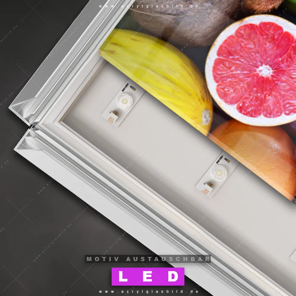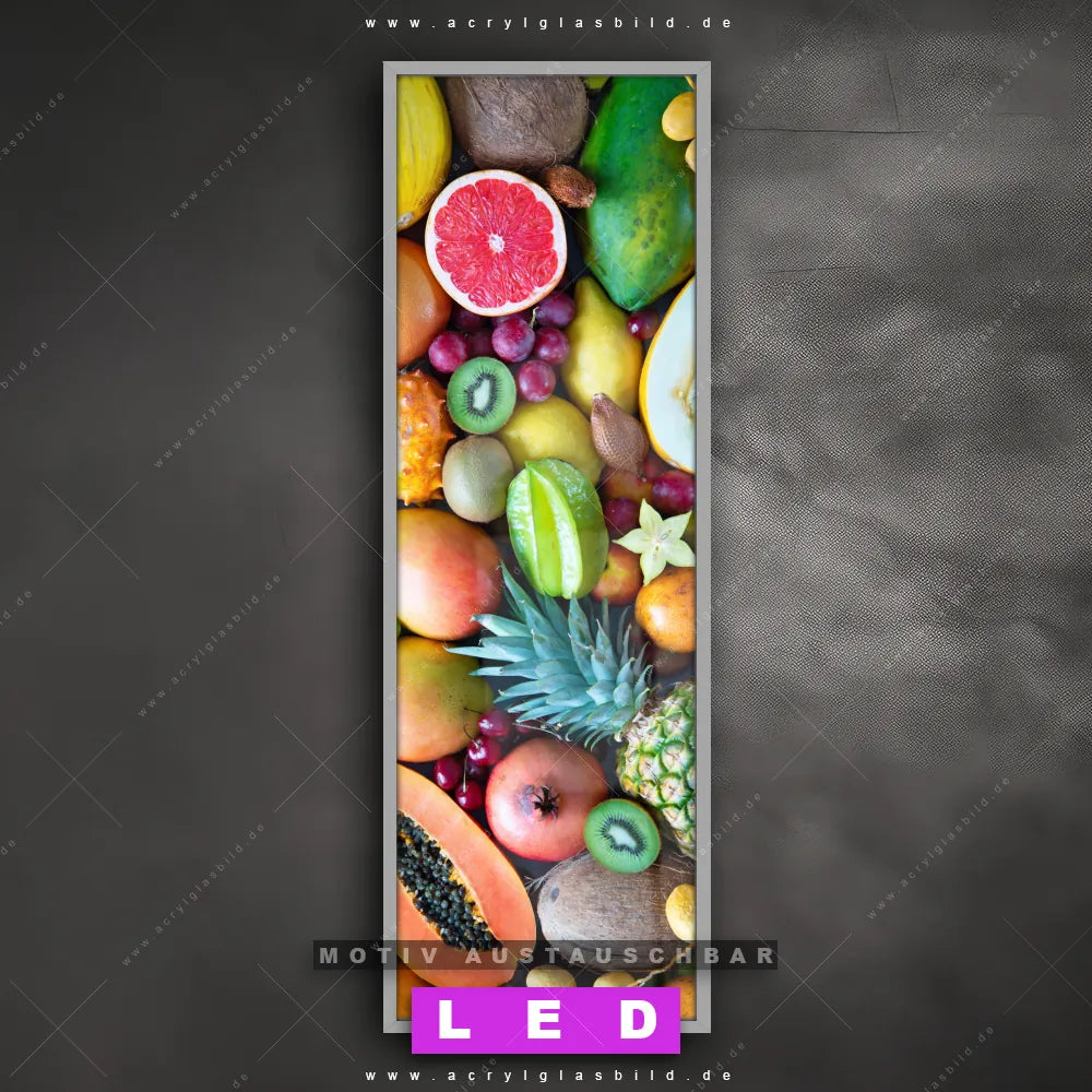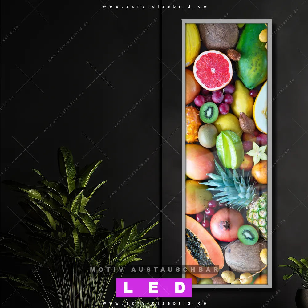 Bist du bereit, deine Wände mit einem dimmbaren LED Bild mit Fernbedienung und optionaler Farbtemperatursteuerung auf das nächste Level zu bringen? Unser Essen - Trinken Canvalight® DIA LED Acrylglasbild ist genau das, was du brauchst! Das Wandbild mit LED Beleuchtung im Schmalen Format mit austauschbarer bedruckter Acrylglas-Scheibe Tropische Früchte bringt Licht und Stil in dein Zuhause – und das in null Komma nichts!