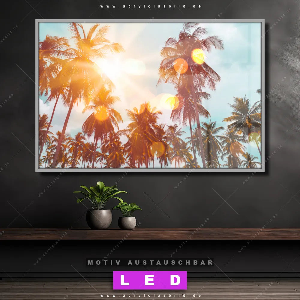 Du bist auf der Suche nach einem dimmbaren Landschaften, Strand - Meer LED Bild mit Fernbedienung und optionaler Farbtemperatursteuerung? Dann haben wir hier genau das richtige Wandbild mit LED Beleuchtung für dich: Unser Canvalight® DIA LED Acrylglasbild Tropische Palmen im Querformat mit austauschbarer bedruckter Acrylglas-Scheibe. Dieses Leuchtbild bringt sofort Partybeleuchtung in deine Räume!