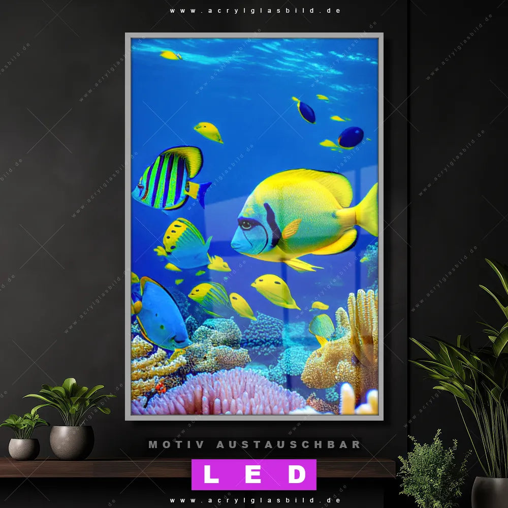 Du suchst nach einem Wandbild mit LED Beleuchtung als ultimativen Hingucker für deine Wände? Dann haben wir das perfekte dimmbare LED Bild mit Fernbedienung und optionaler Farbtemperatursteuerung für dich: unser abgefahrenes Strand - Meer, Tierwelt Canvalight® DIA LED Acrylglasbild! Mit dem LED Leuchtbild aus Acrylglas Tropische Unterwasserwelt im Hochformat mit austauschbarer bedruckter Acrylglas-Scheibe bringst du nicht nur Licht, sondern auch ordentlich Stil in deine Bude.