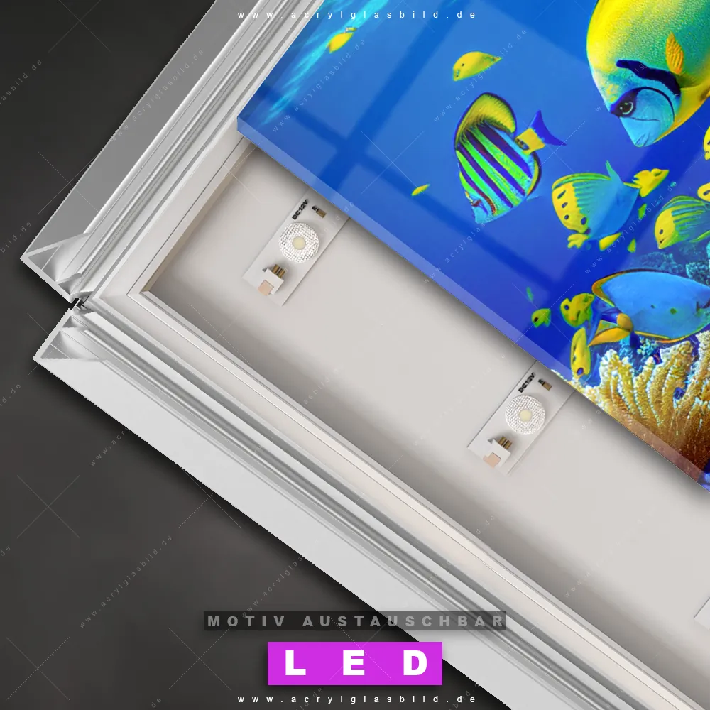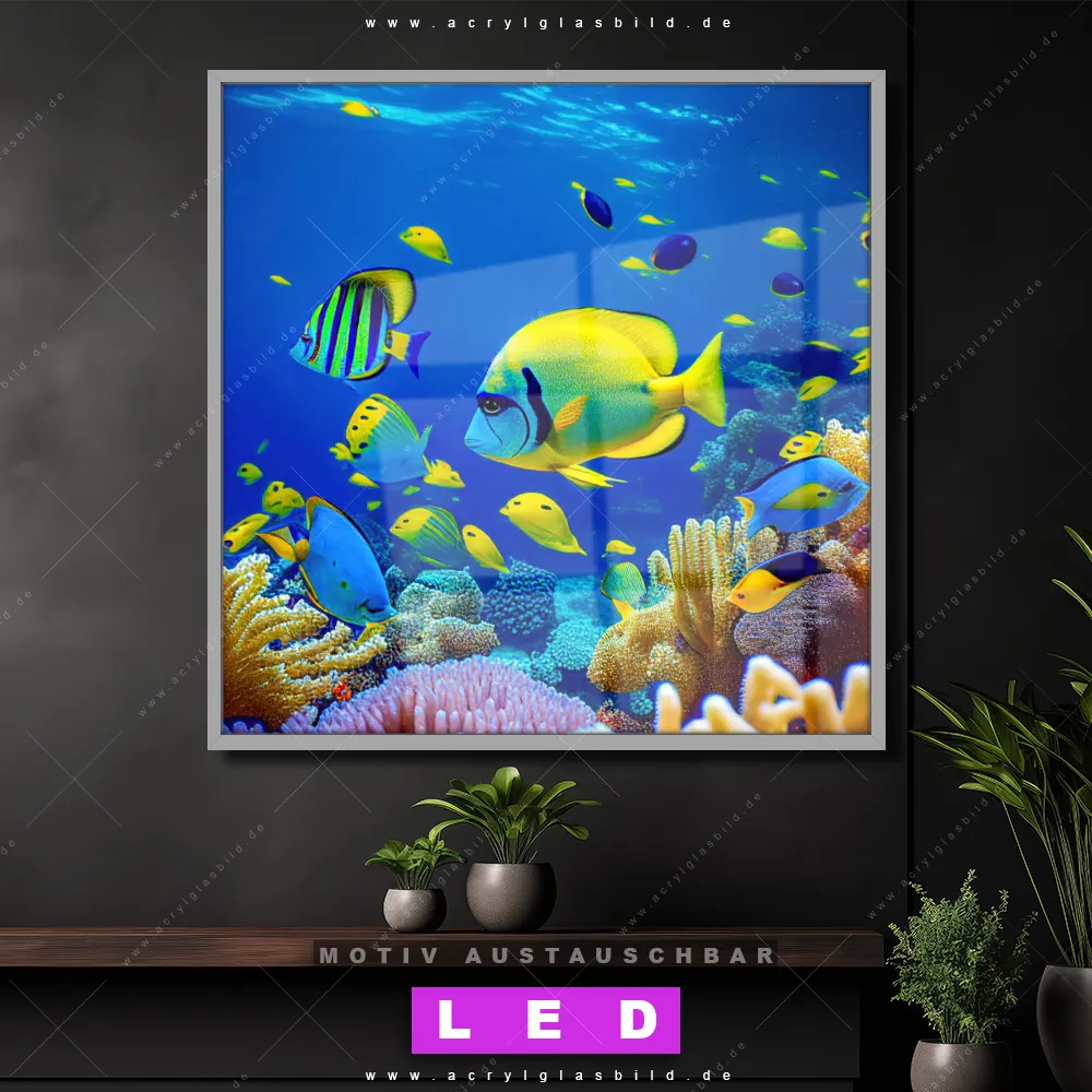 Bist du bereit, deine Wände mit einem dimmbaren LED Bild mit Fernbedienung und optionaler Farbtemperatursteuerung zum Leuchten zu bringen? Wir haben das ultimative Strand - Meer, Tierwelt LED Acrylglasbild Canvalight® DIA für dich! Unser LED Wandbild aus Acrylglas Tropische Unterwasserwelt im Quadratischen Format mit austauschbarer bedruckter Acrylglas-Scheibe im DIA-Klapprahmen bringt sofort jede Menge Glanz in deine vier Wände.