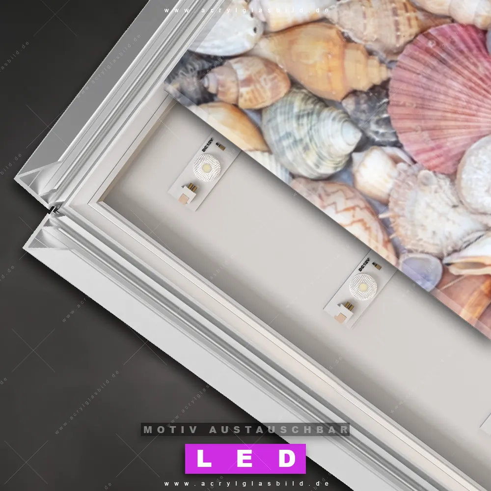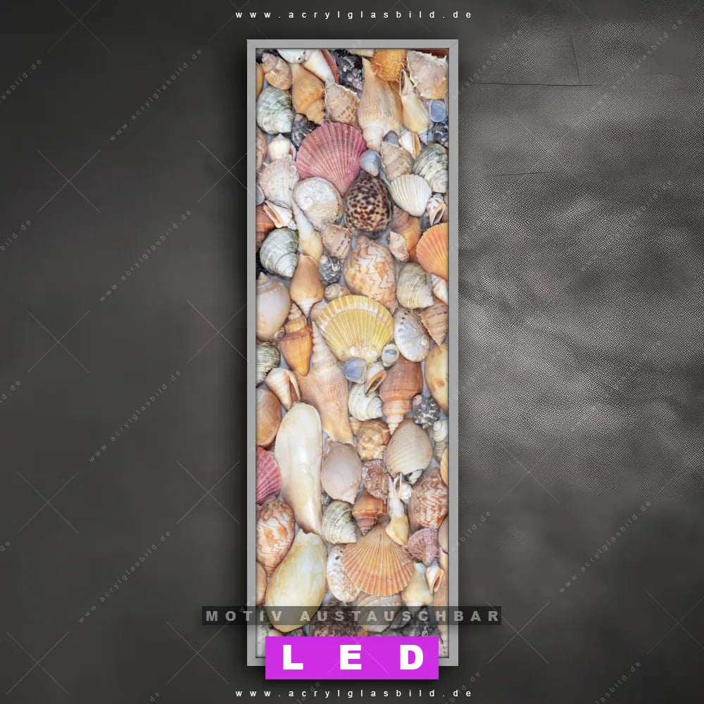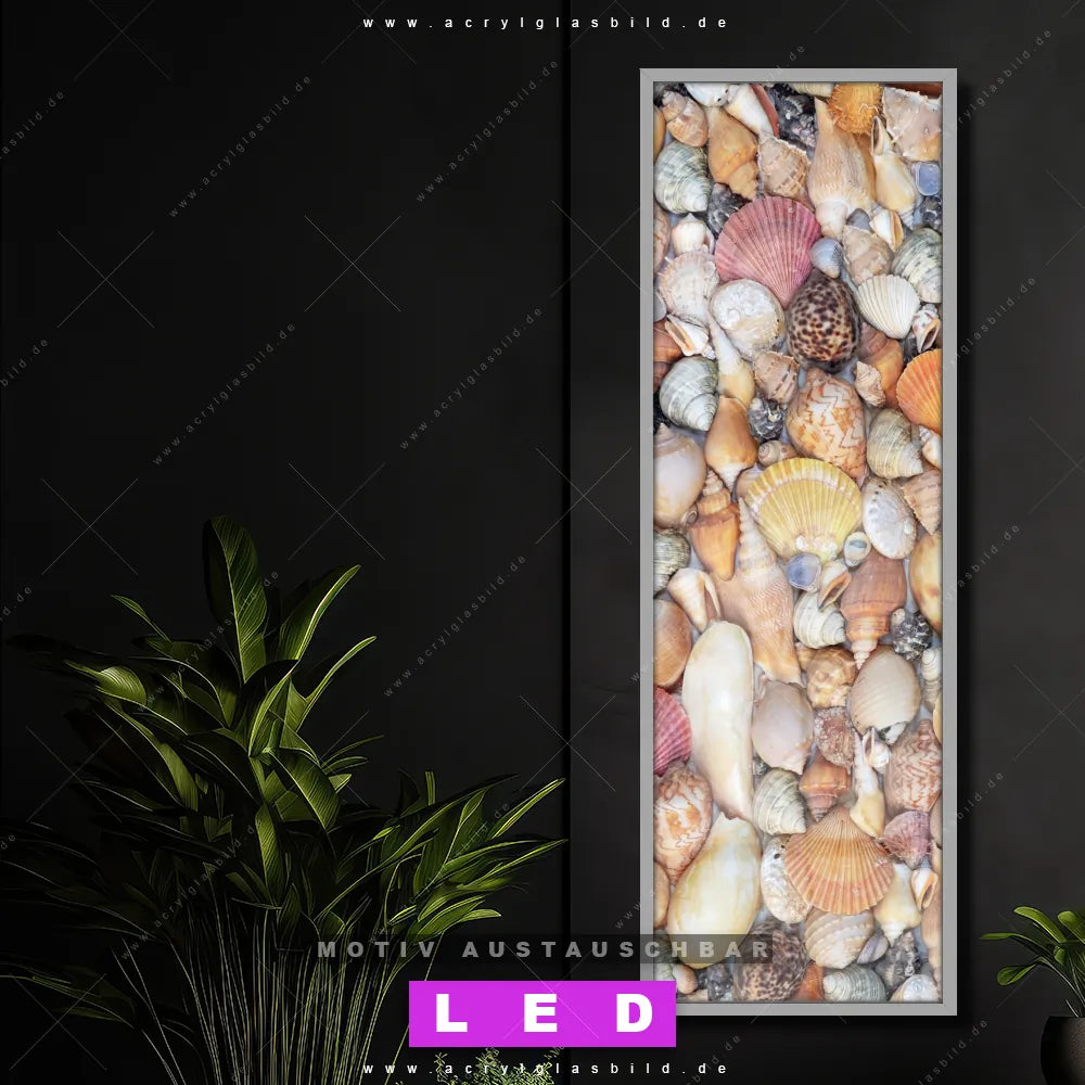 Bist du bereit, deine Wände mit einem dimmbaren LED Bild mit Fernbedienung und optionaler Farbtemperatursteuerung auf das nächste Level zu bringen? Unser Strand - Meer, Muster - Texturen Canvalight® DIA LED Acrylglasbild ist genau das, was du brauchst! Das Wandbild mit LED Beleuchtung im Schmalen Format mit austauschbarer bedruckter Acrylglas-Scheibe Viele Muscheln bringt Licht und Stil in dein Zuhause – und das in null Komma nichts!