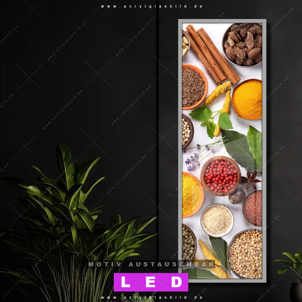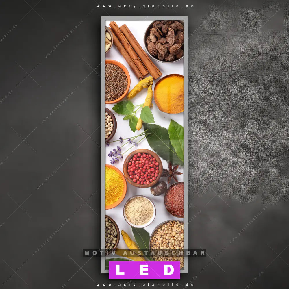 Bist du bereit, deine Wände mit einem dimmbaren LED Bild mit Fernbedienung und optionaler Farbtemperatursteuerung auf das nächste Level zu bringen? Unser Essen - Trinken Canvalight® DIA LED Acrylglasbild ist genau das, was du brauchst! Das Wandbild mit LED Beleuchtung im Schmalen Format mit austauschbarer bedruckter Acrylglas-Scheibe Vielfältige Gewürze bringt Licht und Stil in dein Zuhause – und das in null Komma nichts!