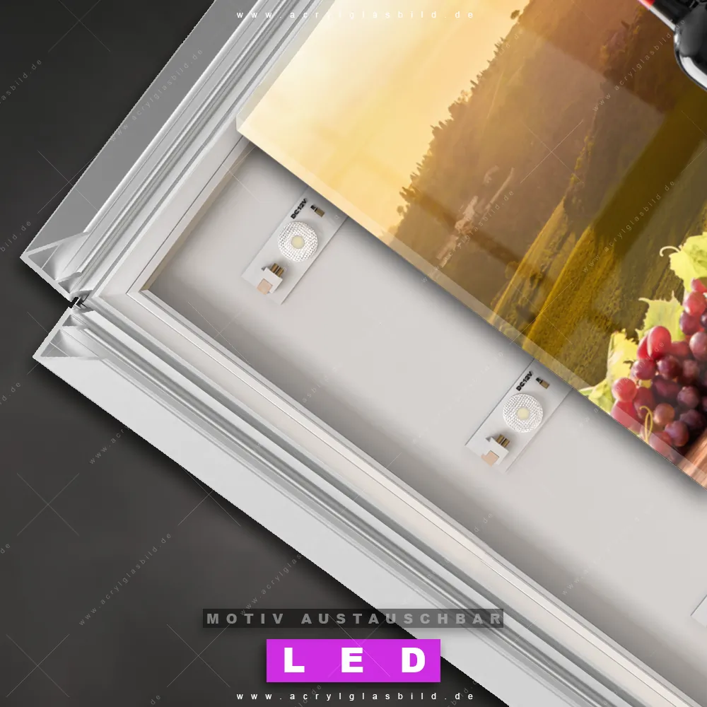 Du bist auf der Suche nach einem dimmbaren Landschaften LED Bild mit Fernbedienung und optionaler Farbtemperatursteuerung? Dann haben wir hier genau das richtige Wandbild mit LED Beleuchtung für dich: Unser Canvalight® DIA LED Acrylglasbild Wein & Toscana im Querformat mit austauschbarer bedruckter Acrylglas-Scheibe. Dieses Leuchtbild bringt sofort Partybeleuchtung in deine Räume!