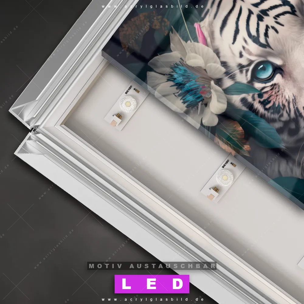 Na, worauf wartest du noch? Mach deine Wände zum Star der Show und bestelle jetzt das Canvalight® DIA LED Acrylglasbild Weißer Tiger zwischen Blumen. Deine Wände werden es dir danken und deine Freunde werden dank der wechselbaren Motive vor Neid platzen!