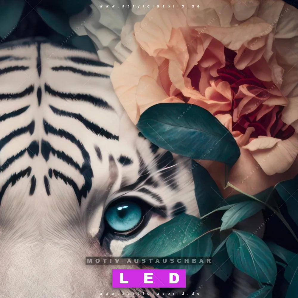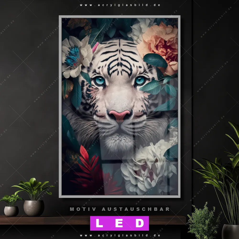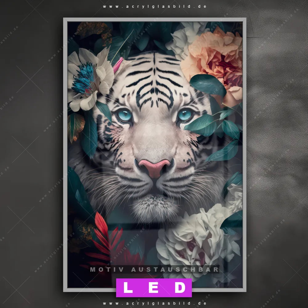 Begriffe wie Raubkatze, Tiger, Afrika, Dschungel, Blumen, Blüten, Blätter, Porträt haben dich auf der Suche nach deinem neuen LED Wandbild aus Acrylglas inspiriert? Dann sollte das LED Acrylglasbild Porträt eines weißen Tigers mit Blumen den Weg zu dir finden.