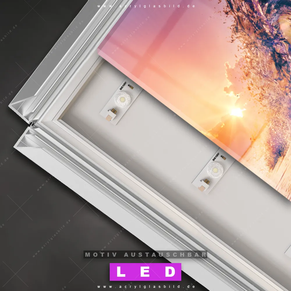 Du suchst nach einem Wandbild mit LED Beleuchtung als ultimativen Hingucker für deine Wände? Dann haben wir das perfekte dimmbare LED Bild mit Fernbedienung und optionaler Farbtemperatursteuerung für dich: unser abgefahrenes Landschaften, Strand - Meer Canvalight® DIA LED Acrylglasbild! Mit dem LED Leuchtbild aus Acrylglas Welle im Sonnenuntergang im Hochformat mit austauschbarer bedruckter Acrylglas-Scheibe bringst du nicht nur Licht, sondern auch ordentlich Stil in deine Bude.