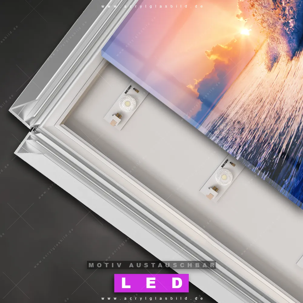 Also, worauf wartest du noch? Gib mit einem beleuchteten Wandbild mit wechselbarer Acrylglas-Scheibe deinen Wänden das gewisse Etwas und bestelle jetzt das LED Acrylglasbild Canvalight® DIA Wellenbruch im Ozean – dein Zuhause wird es dir danken und deine Freunde werden dank der wechselbaren Motive erblassen!
