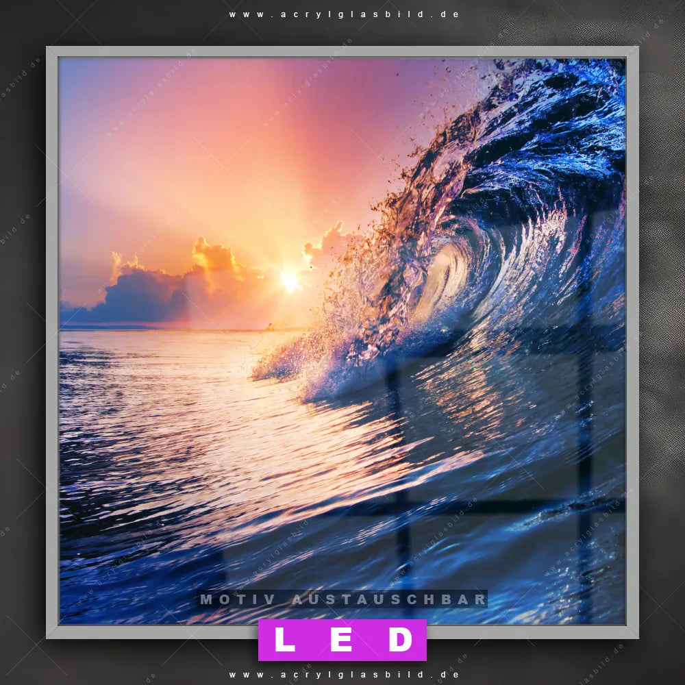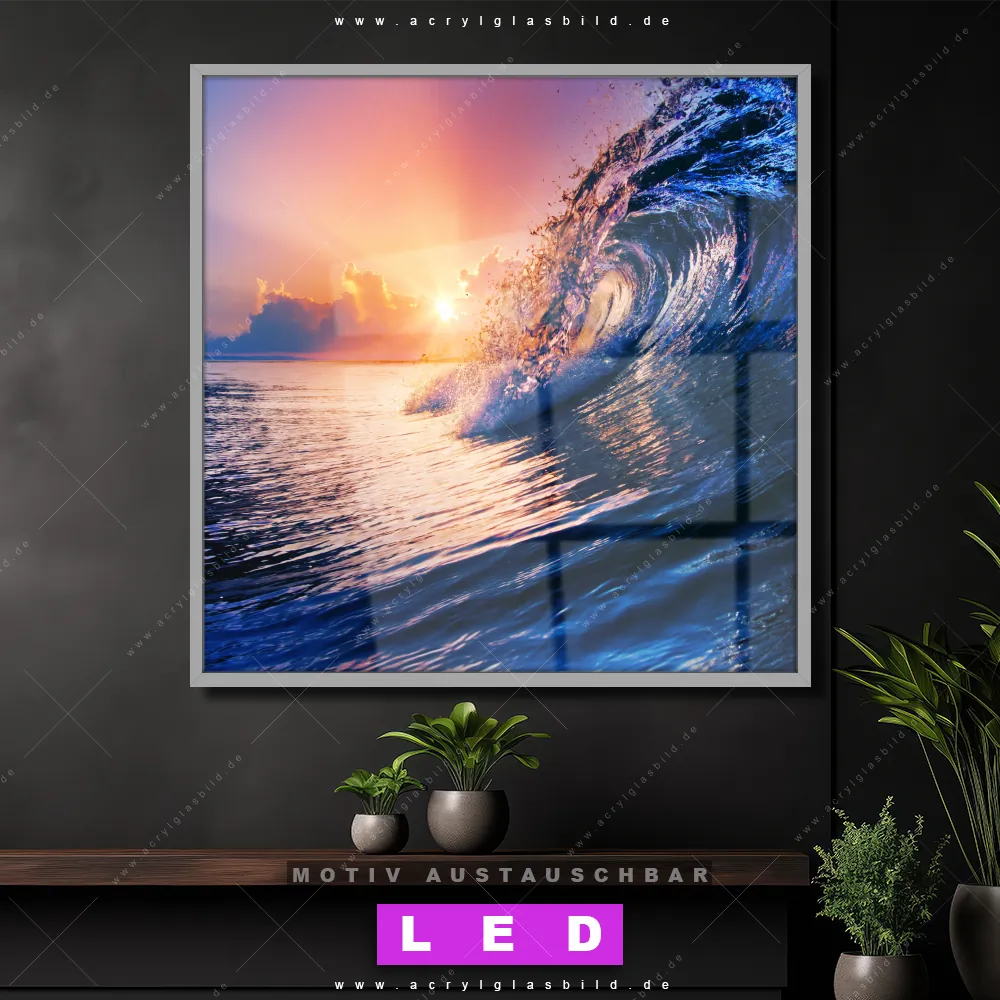 Bist du bereit, deine Wände mit einem dimmbaren LED Bild mit Fernbedienung und optionaler Farbtemperatursteuerung zum Leuchten zu bringen? Wir haben das ultimative Landschaften, Strand - Meer LED Acrylglasbild Canvalight® DIA für dich! Unser LED Wandbild aus Acrylglas Welle im Sonnenuntergang im Quadratischen Format mit austauschbarer bedruckter Acrylglas-Scheibe im DIA-Klapprahmen bringt sofort jede Menge Glanz in deine vier Wände.