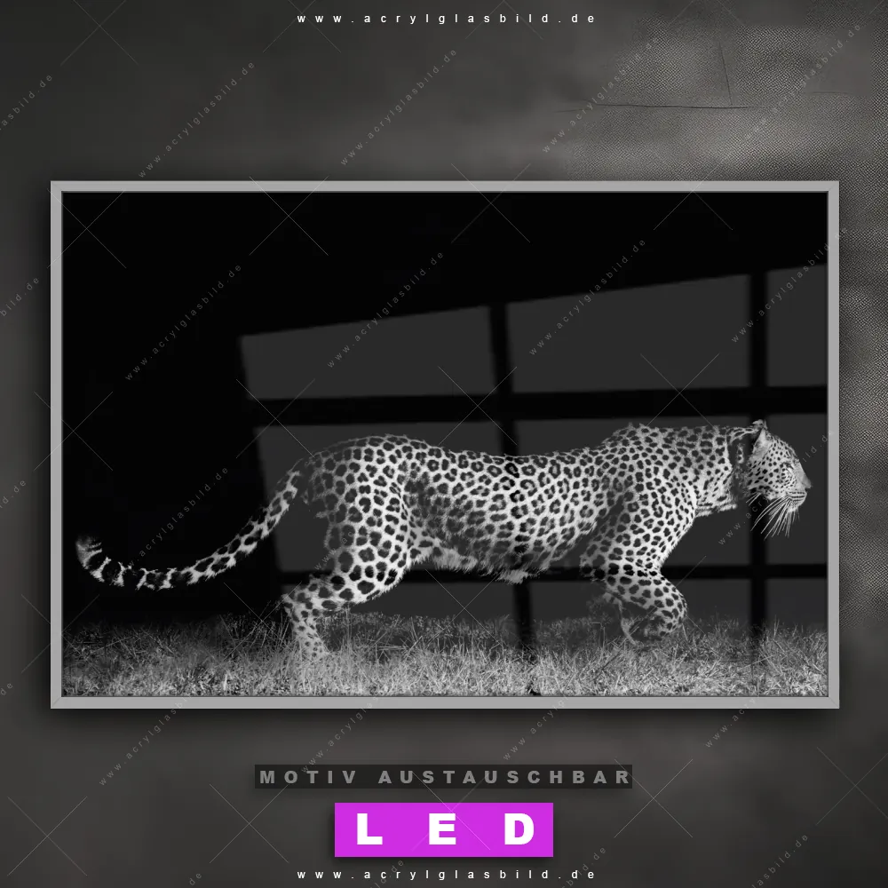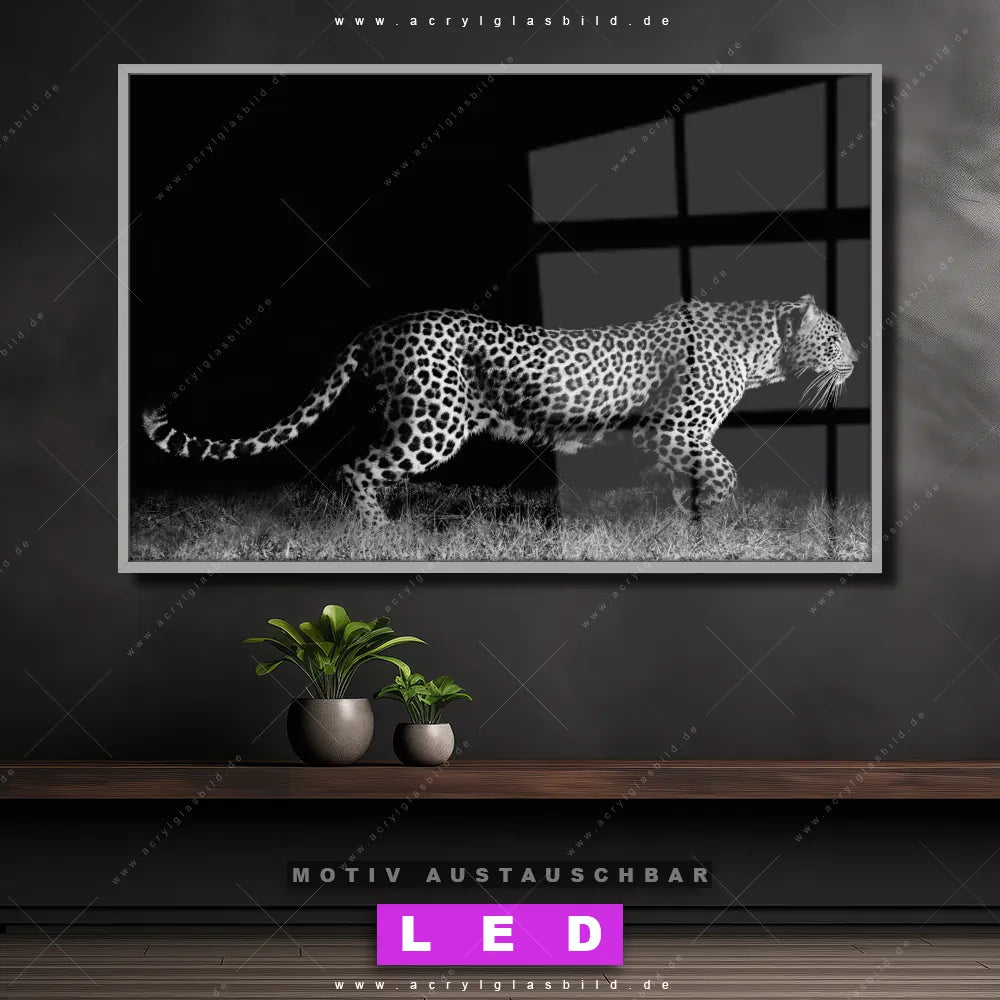Begriffe wie Raubkatze, Leopard, Afrika, Dschungel, wild, Safari, frei, Nacht, dunkel haben dich auf der Suche nach deinem neuen LED Wandbild aus Acrylglas inspiriert? Dann sollte das LED Acrylglasbild Leopard schwarz-weiß den Weg zu dir finden.