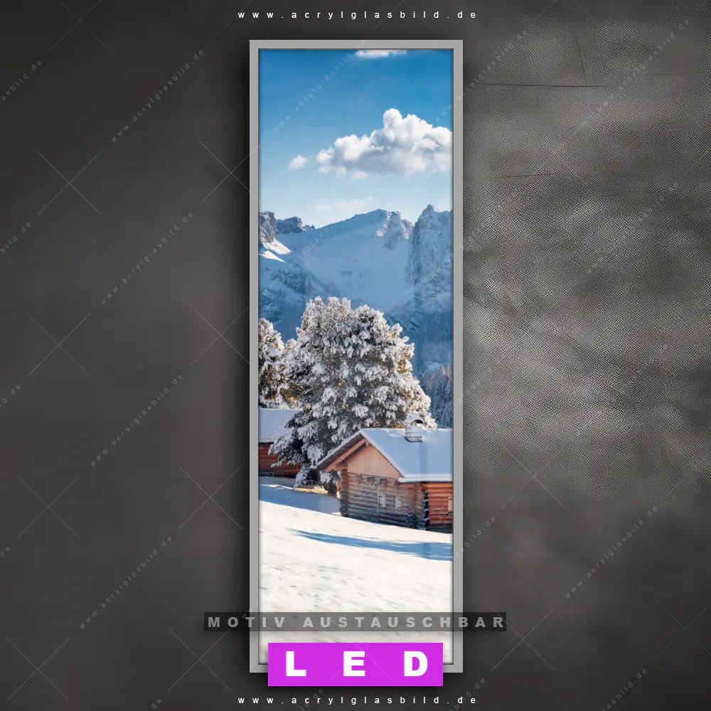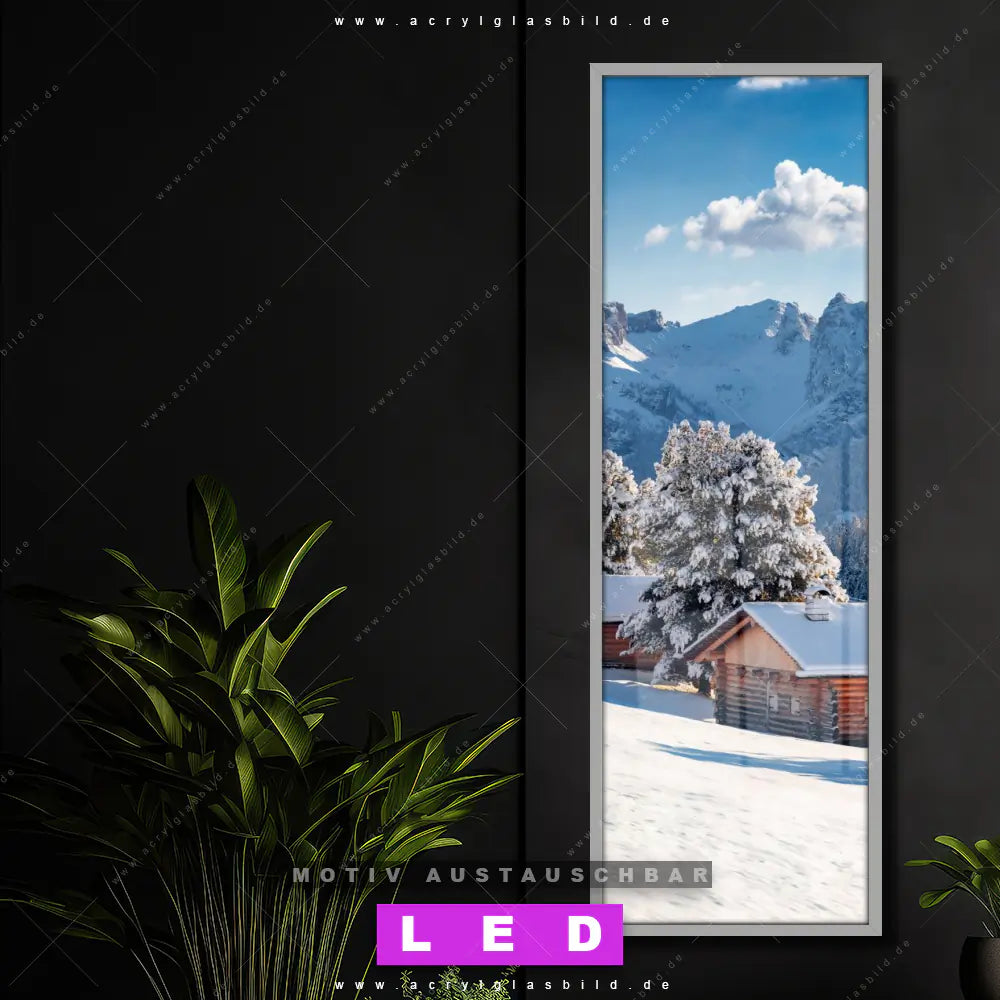Bist du bereit, deine Wände mit einem dimmbaren LED Bild mit Fernbedienung und optionaler Farbtemperatursteuerung auf das nächste Level zu bringen? Unser Landschaften, Winter Canvalight® DIA LED Acrylglasbild ist genau das, was du brauchst! Das Wandbild mit LED Beleuchtung im Schmalen Format mit austauschbarer bedruckter Acrylglas-Scheibe Winteridylle in den Bergen bringt Licht und Stil in dein Zuhause – und das in null Komma nichts!