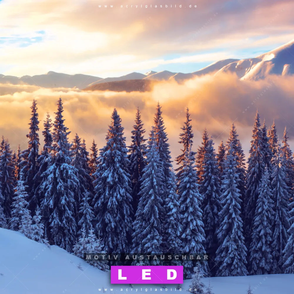 Begriffe wie Berge, Gebirge, Schneelandschaft, Winter, Schnee, Sonnenaufgang, Weihnachten, Nadelwald haben dich auf der Suche nach deinem neuen LED Wandbild aus Acrylglas inspiriert? Dann sollte das LED Acrylglasbild Verschneite Bäume den Weg zu dir finden.
