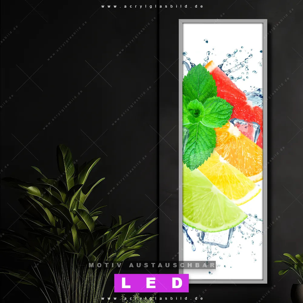 Bist du bereit, deine Wände mit einem dimmbaren LED Bild mit Fernbedienung und optionaler Farbtemperatursteuerung auf das nächste Level zu bringen? Unser Essen - Trinken Canvalight® DIA LED Acrylglasbild ist genau das, was du brauchst! Das Wandbild mit LED Beleuchtung im Schmalen Format mit austauschbarer bedruckter Acrylglas-Scheibe Zitrusfrüchte auf Eis bringt Licht und Stil in dein Zuhause – und das in null Komma nichts!