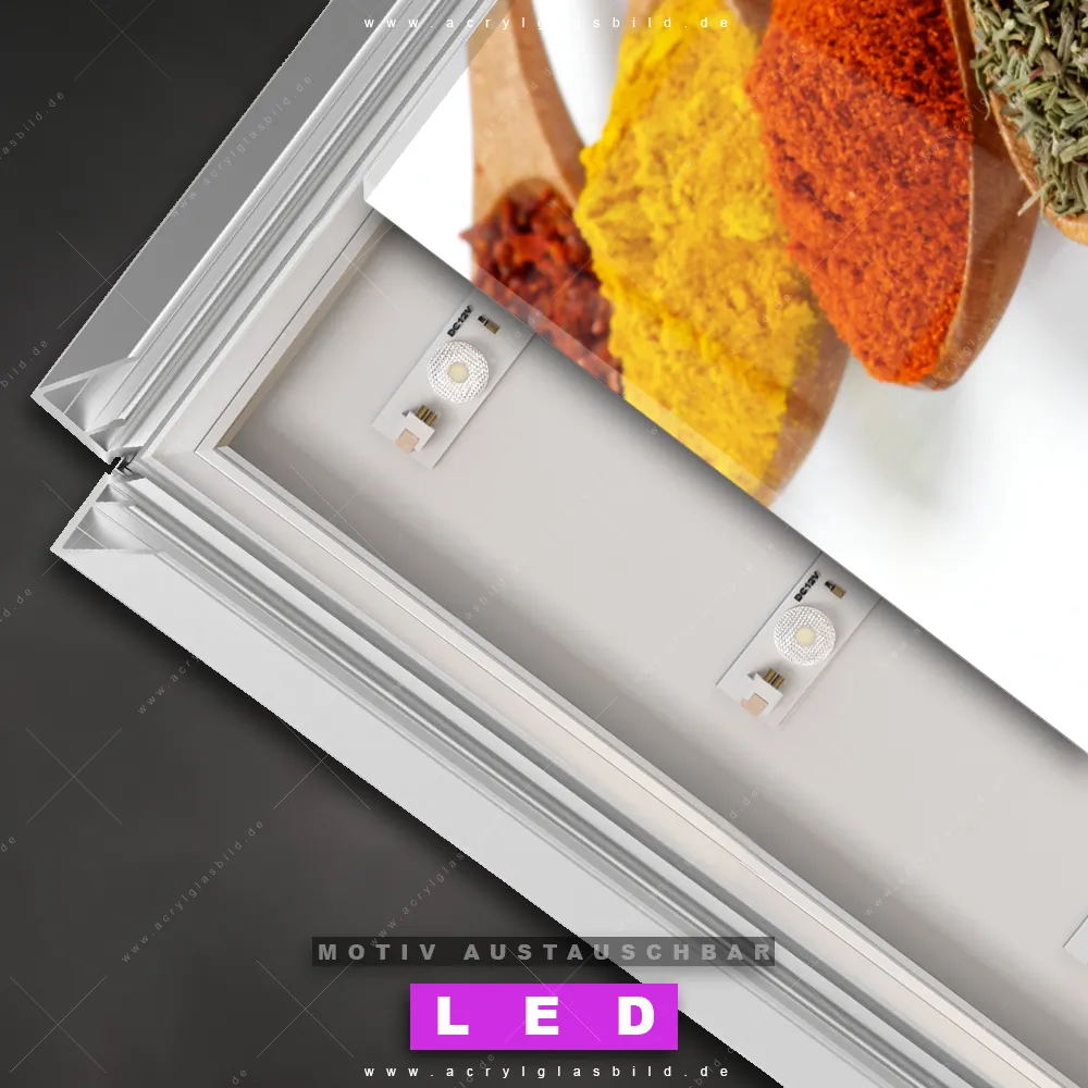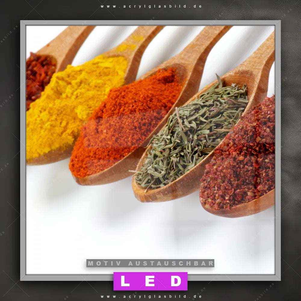Also, worauf wartest du noch? Gib mit einem beleuchteten Wandbild mit wechselbarer Acrylglas-Scheibe deinen Wänden das gewisse Etwas und bestelle jetzt das LED Acrylglasbild Canvalight® DIA Verschiedene Gewürze auf Löffeln – dein Zuhause wird es dir danken und deine Freunde werden dank der wechselbaren Motive erblassen!