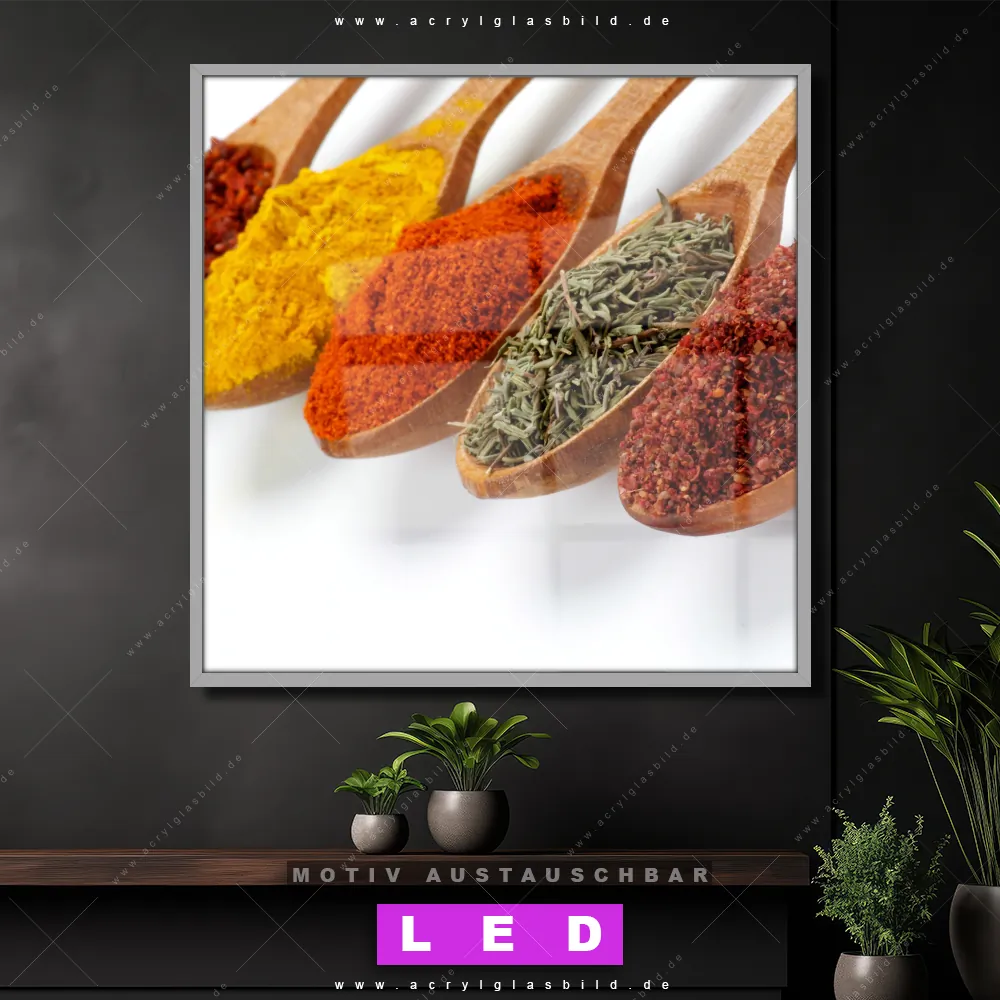 Bist du bereit, deine Wände mit einem dimmbaren LED Bild mit Fernbedienung und optionaler Farbtemperatursteuerung zum Leuchten zu bringen? Wir haben das ultimative Essen - Trinken LED Acrylglasbild Canvalight® DIA für dich! Unser LED Wandbild aus Acrylglas Farbige Gewürze auf Holzlöffel im Quadratischen Format mit austauschbarer bedruckter Acrylglas-Scheibe im DIA-Klapprahmen bringt sofort jede Menge Glanz in deine vier Wände.