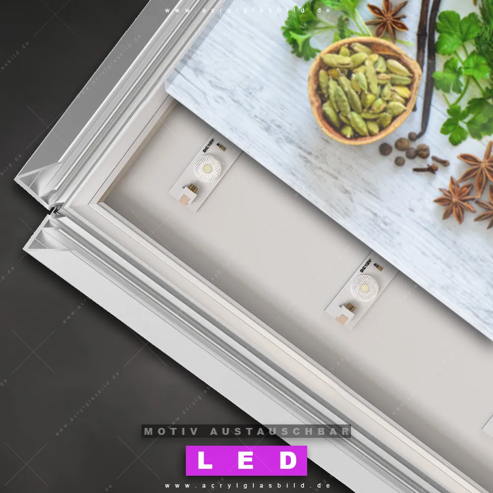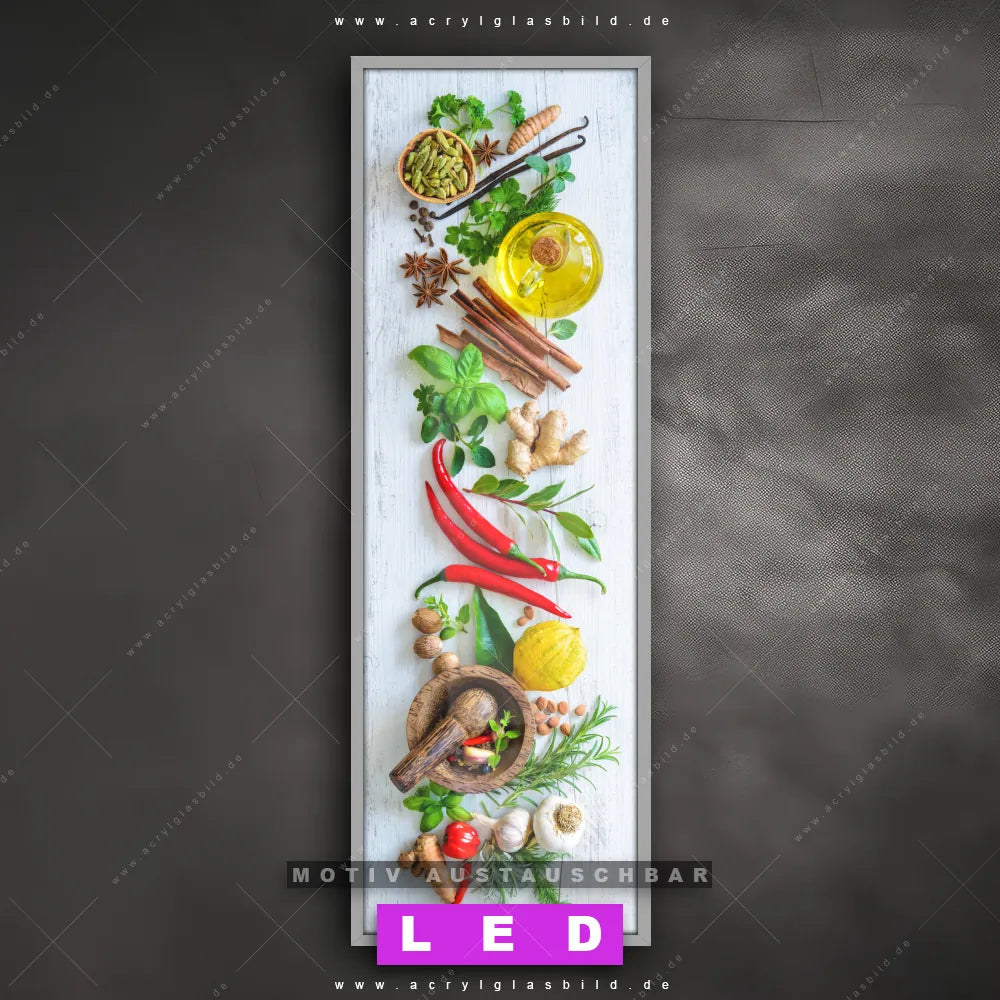 Bist du bereit, deine Wände mit einem dimmbaren LED Bild mit Fernbedienung und optionaler Farbtemperatursteuerung auf das nächste Level zu bringen? Unser Essen - Trinken Canvalight® DIA LED Acrylglasbild ist genau das, was du brauchst! Das Wandbild mit LED Beleuchtung im Schmalen Format mit austauschbarer bedruckter Acrylglas-Scheibe Frische Kräuter & Gewürze bringt Licht und Stil in dein Zuhause – und das in null Komma nichts!