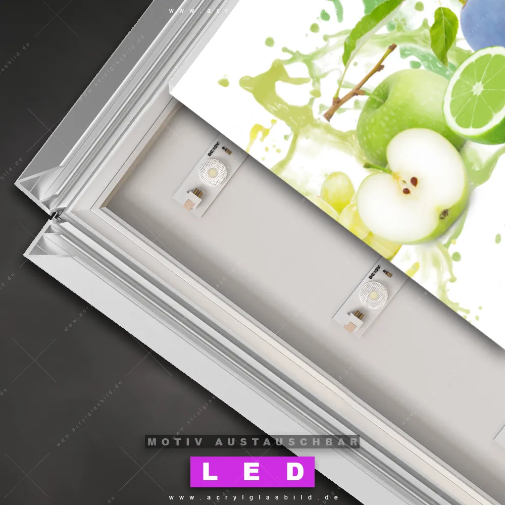 Also, worauf wartest du noch? Gib mit einem beleuchteten Wandbild mit wechselbarer Acrylglas-Scheibe deinen Wänden das gewisse Etwas und bestelle jetzt das LED Acrylglasbild Canvalight® DIA bunte Früchte mit Spritzern – dein Zuhause wird es dir danken und deine Freunde werden dank der wechselbaren Motive erblassen!