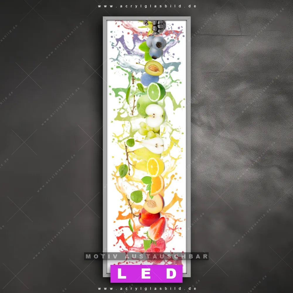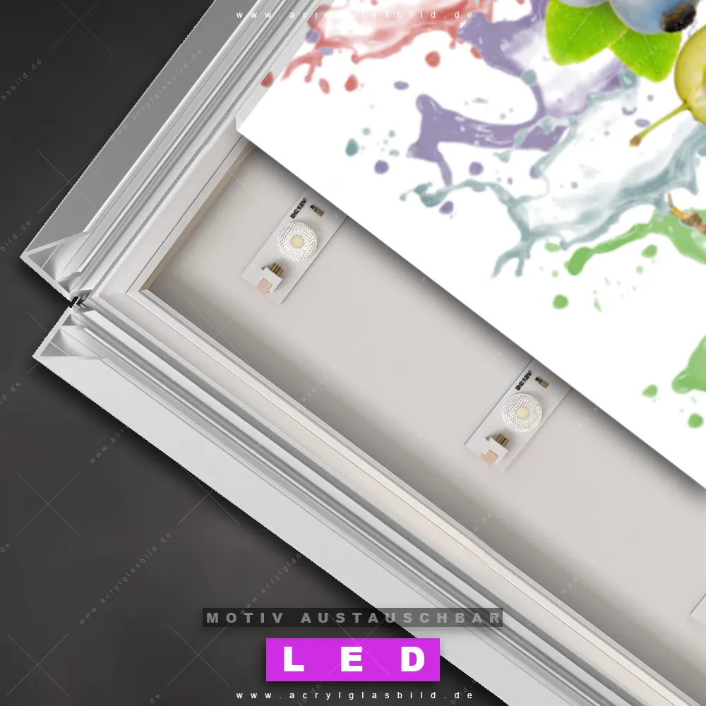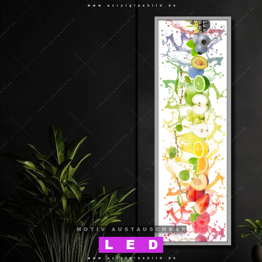 Bist du bereit, deine Wände mit einem dimmbaren LED Bild mit Fernbedienung und optionaler Farbtemperatursteuerung auf das nächste Level zu bringen? Unser Essen - Trinken Canvalight® DIA LED Acrylglasbild ist genau das, was du brauchst! Das Wandbild mit LED Beleuchtung im Schmalen Format mit austauschbarer bedruckter Acrylglas-Scheibe Fruchtspritzer bringt Licht und Stil in dein Zuhause – und das in null Komma nichts!