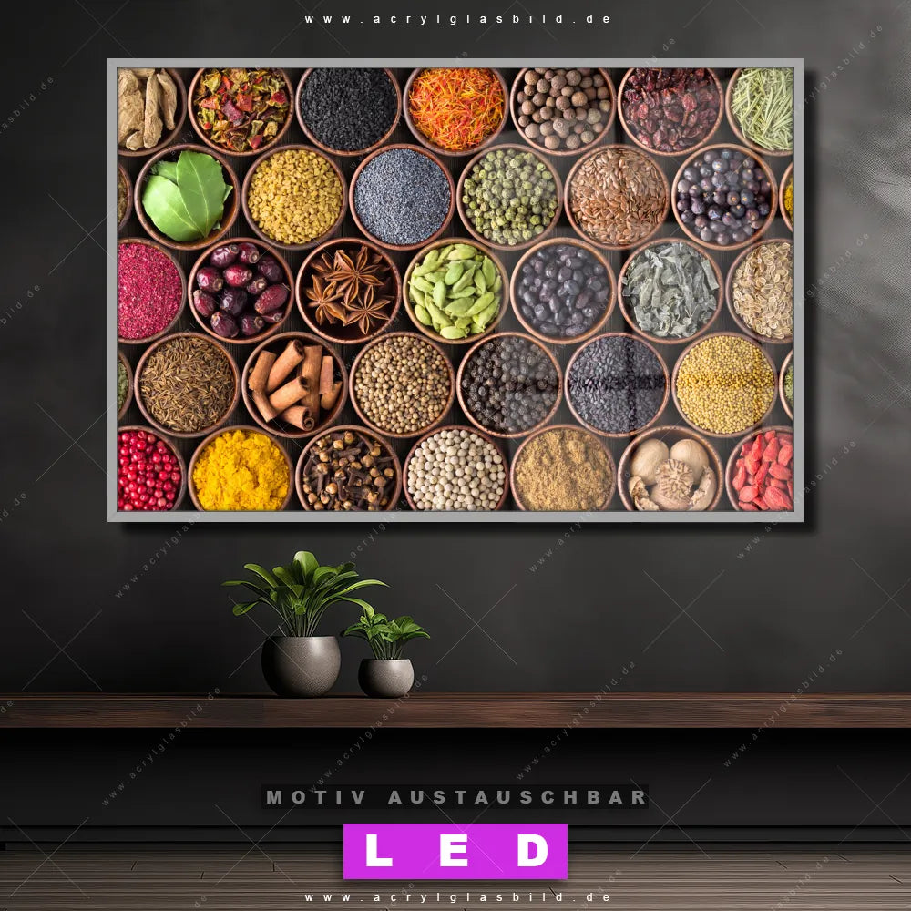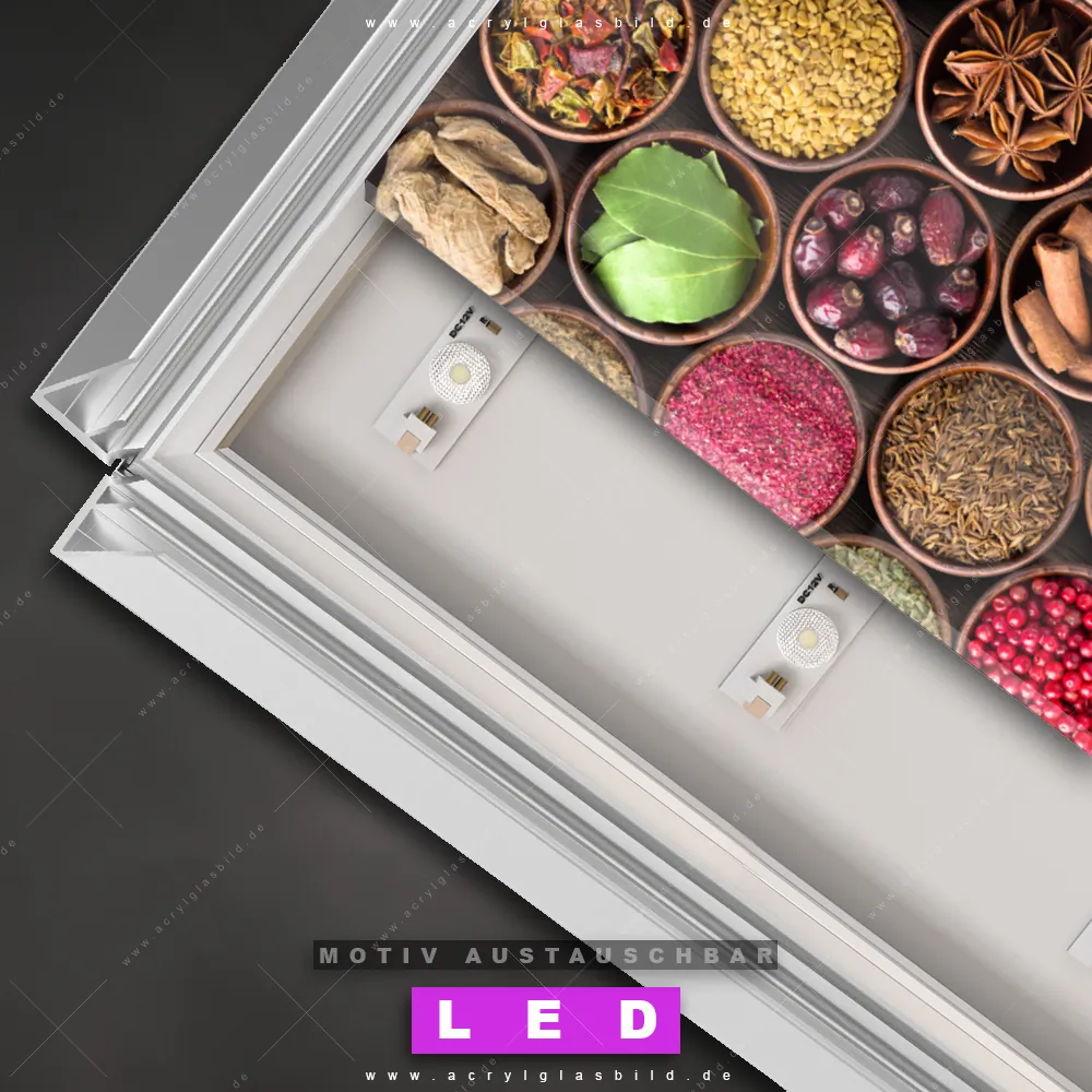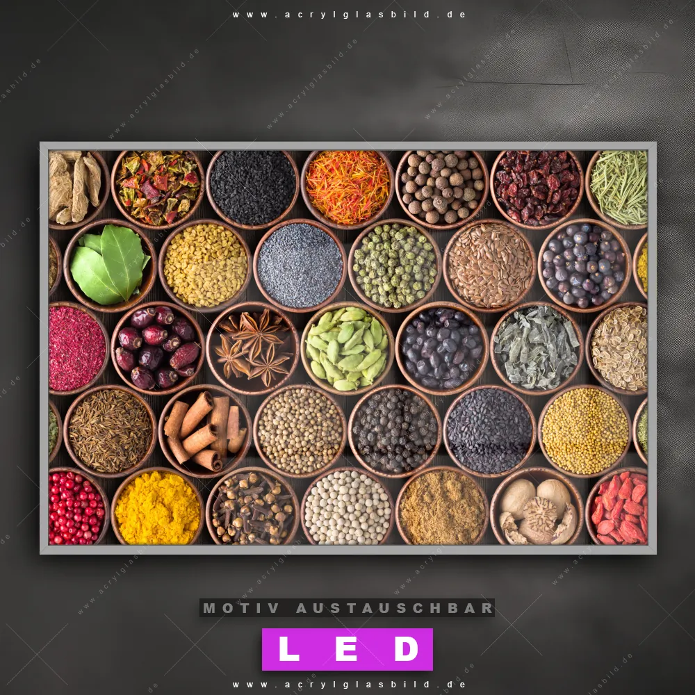 Du bist auf der Suche nach einem dimmbaren Essen - Trinken LED Bild mit Fernbedienung und optionaler Farbtemperatursteuerung? Dann haben wir hier genau das richtige Wandbild mit LED Beleuchtung für dich: Unser Canvalight® DIA LED Acrylglasbild Gewürze & Kräuter im Querformat mit austauschbarer bedruckter Acrylglas-Scheibe. Dieses Leuchtbild bringt sofort Partybeleuchtung in deine Räume!