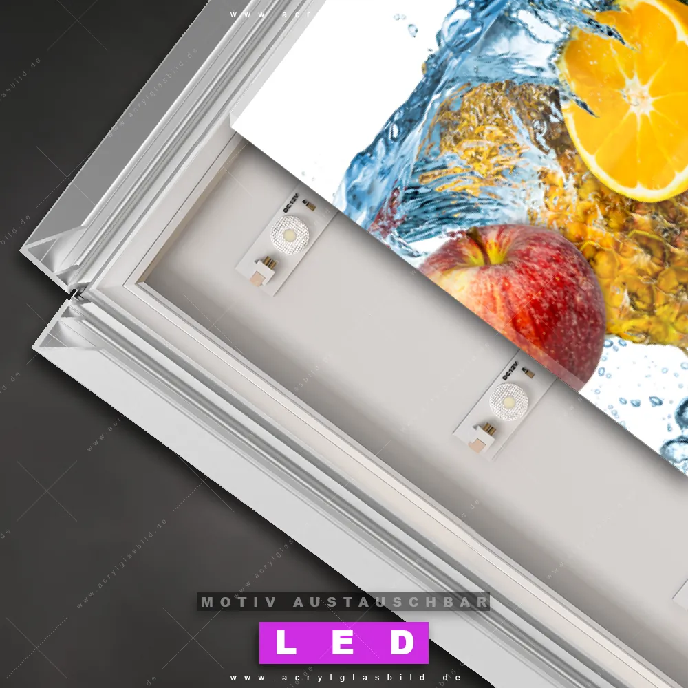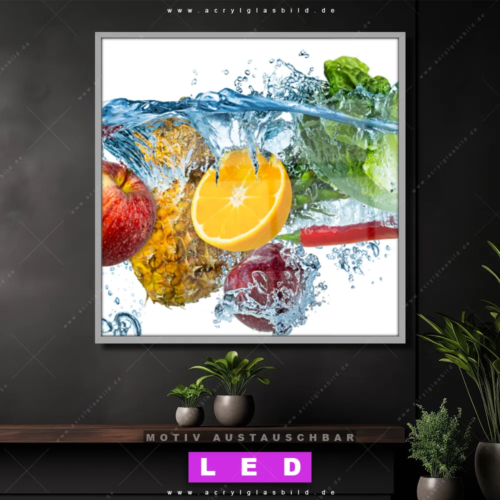Also, worauf wartest du noch? Gib mit einem beleuchteten Wandbild mit wechselbarer Acrylglas-Scheibe deinen Wänden das gewisse Etwas und bestelle jetzt das LED Acrylglasbild Canvalight® DIA Obst & Gemüse mit Wasserspritzern – dein Zuhause wird es dir danken und deine Freunde werden dank der wechselbaren Motive erblassen!